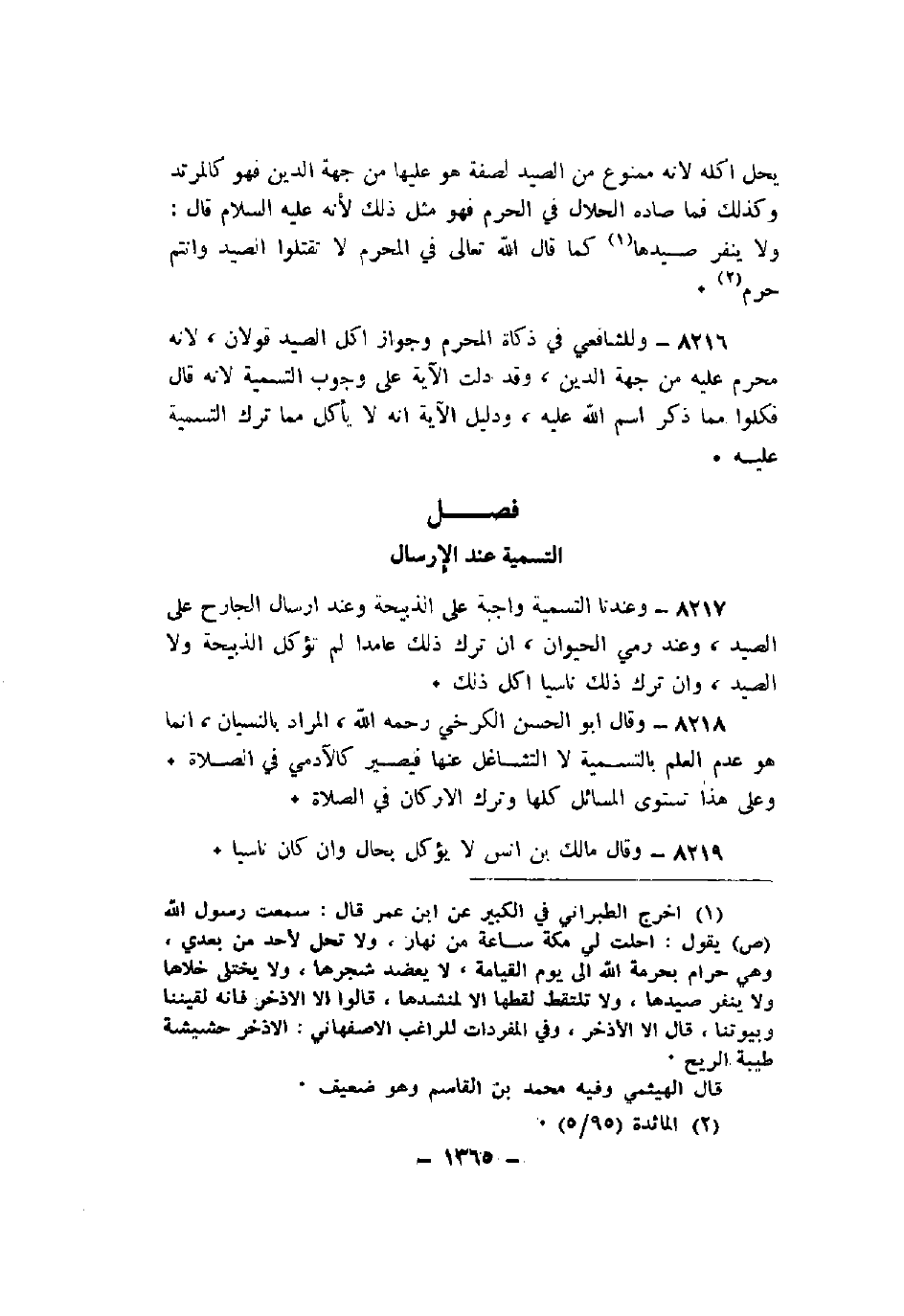 8217 - وعندنا التسمية واجبة على الذبيحة وعند إرسال الجارح على الصيد، وعند رمي الحيوان، إن ترك ذلك عامدا لم تؤكل الذبيحة ولا الصيد، وإن ترك ذلك ناسيا أكل ذلك.