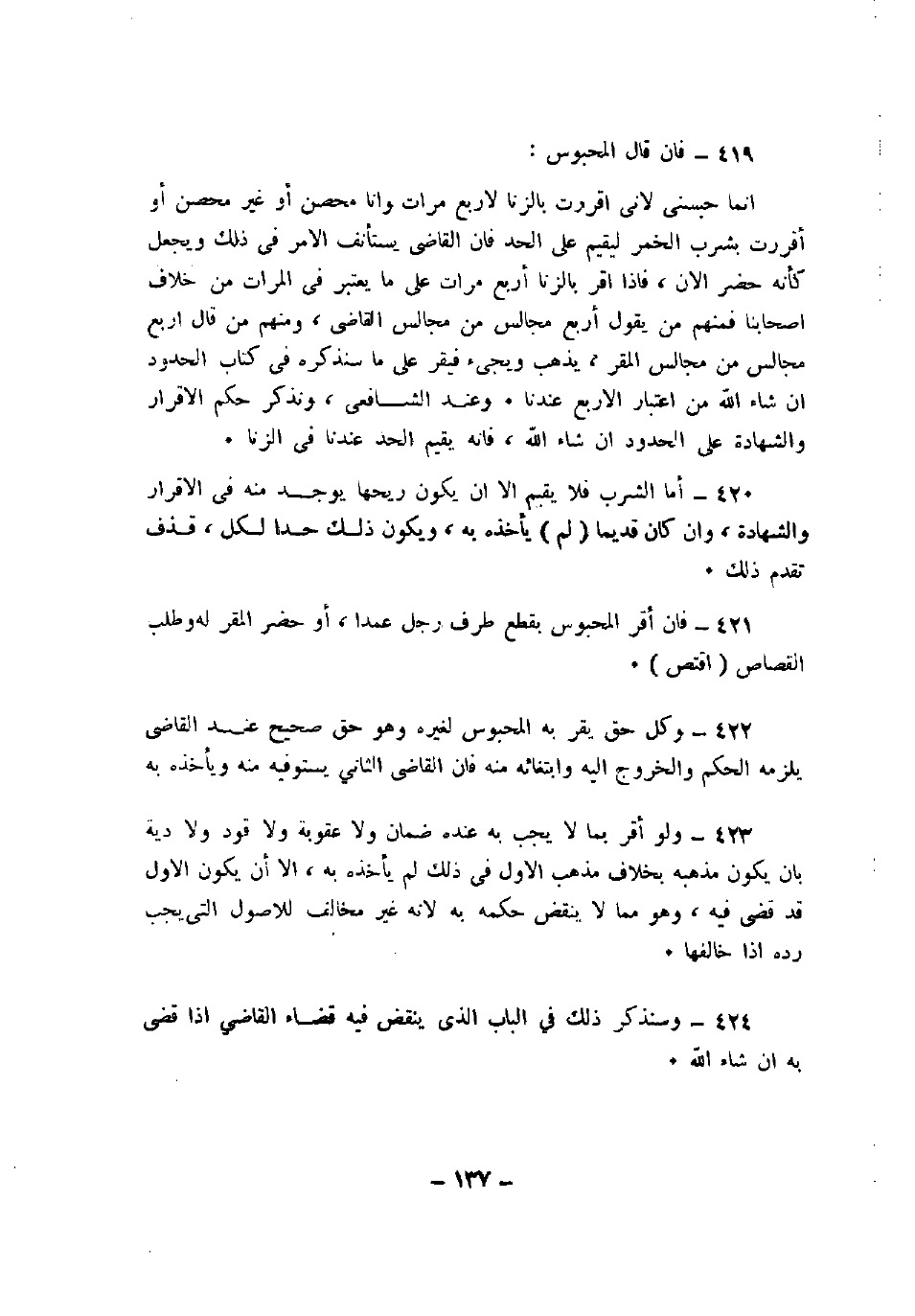 423 - ولو أقر بما لا يجب به عنده ضمان ولا عقوبة ولا قود ولا دية بأن يكون مذهبه بخلاف مذهب الأول في ذلك لم يأخذه به، إلا أن يكون الأول قد قضى فيه، وهو مما لا ينقض حكمه به لأنه غير مخالف للأصول التي يجب رده إذا خالفها.