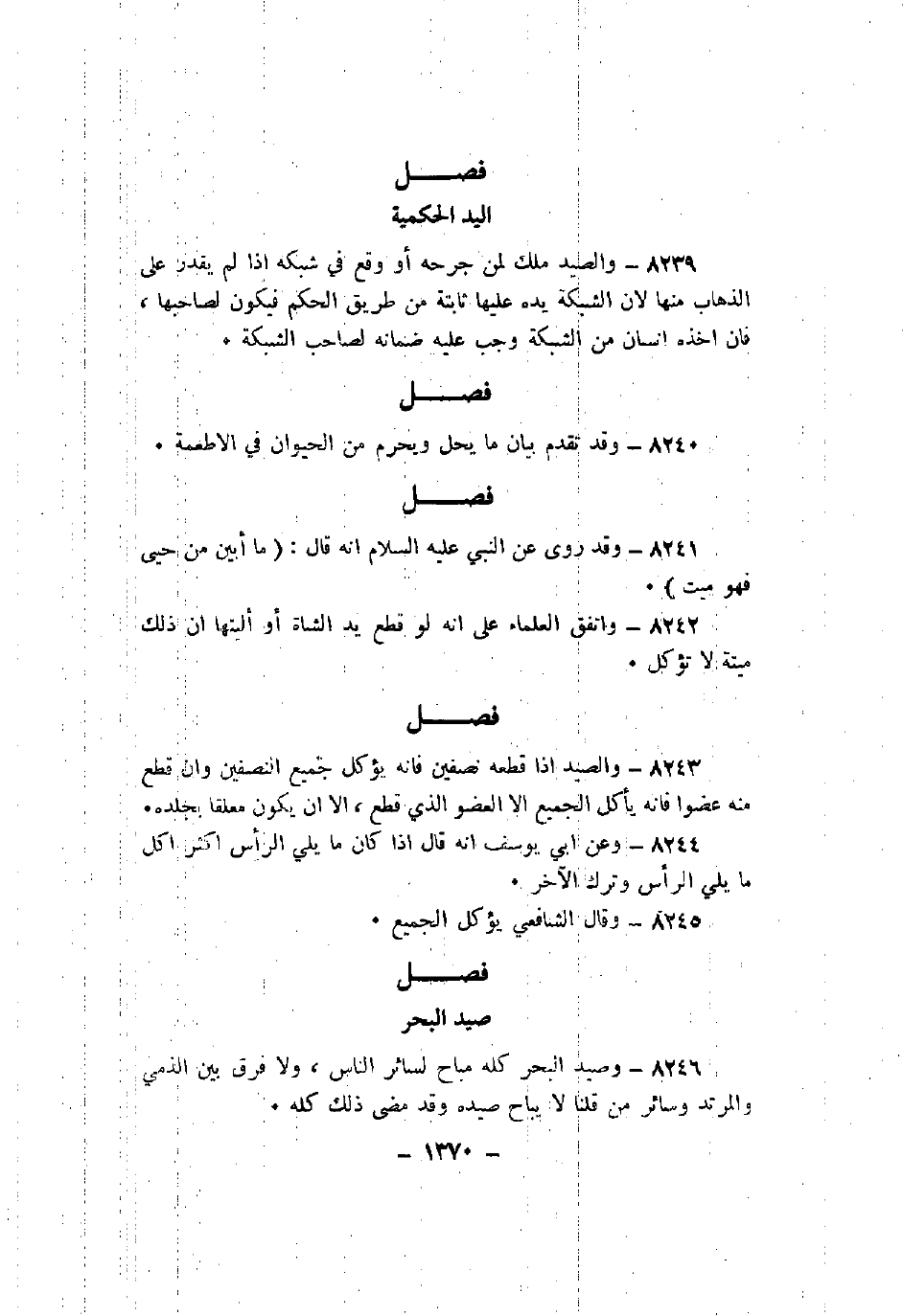8243 - والصيد إذا قطعه نصفين فإنه يؤكل جميع النصفين وإن قطع منه عضوا فإنه يأكل الجميع إلا العضو الذي قطع، إلا أن يكون معلقا بجلده.