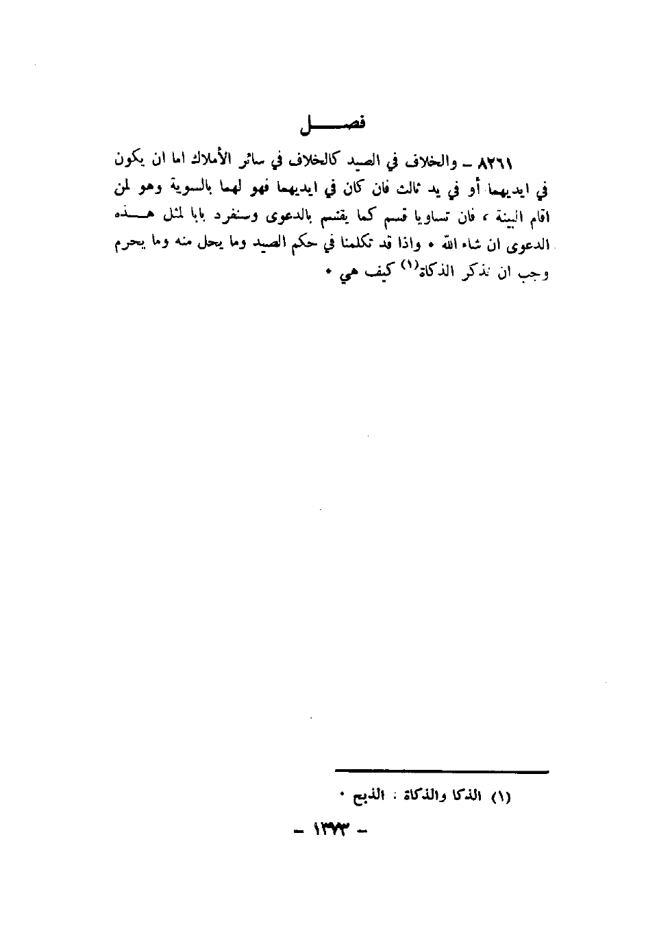 8261 - والخلاف في الصيد كالخلاف في سائر الأملاك إما أن يكون في أيديهما أو في يد ثالث فإن كان في أيديهما فهو لهما بالسوية وهو لمن أقام البينة، فإن تساويا قسم كما يقتسم بالدعوى وسنفرد بابا لمثل هذه الدعوى إن شاء الله. وإذا قد تكلمنا في حكم الصيد وما يحل منه وما يحرم وجب أن نذكر الذكاة كيف هي.