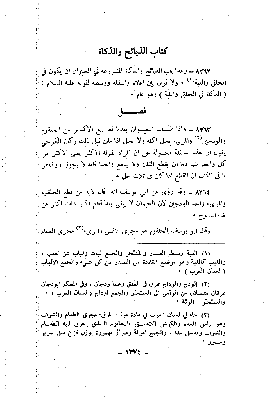 8263 - وإذا مات الحيوان بعدما قطع الأكثر من الحلقوم والوجين والمريء يحل أكله ولا يحل إذا مات قبل ذلك وكان الكرخي يقول إن هذه المسئلة محمولة على أن المراد بقوله الأكثر يعني الأكثر من كل واحد منها فأما أن يقطع الثلث ولا يقطع واحدا فإنه لا يجوز، وظاهر ما في الكتب أن القطع إذا كان في ثلاث حل.