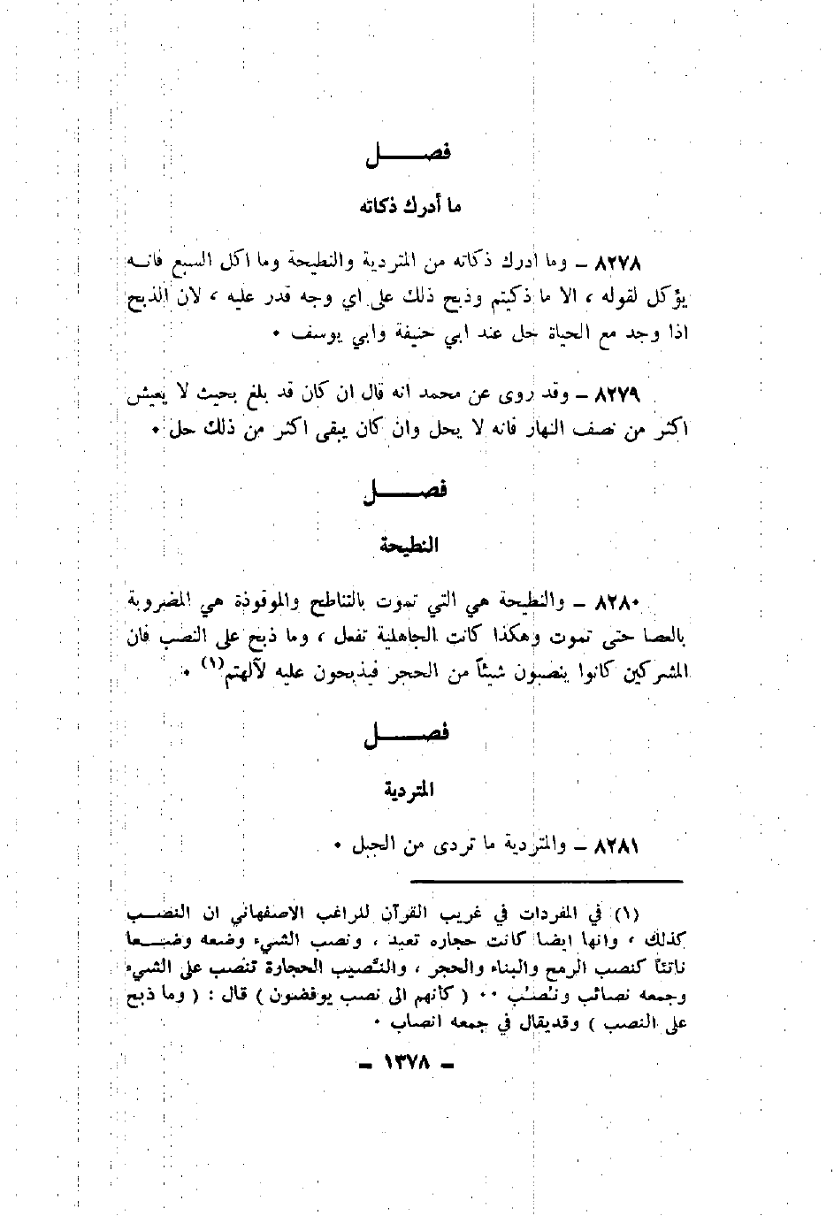 8278 - وما أدرك ذكاته من المنردية والنطيحة وما أكل السبع فإنه يؤكل لقوله، إلا ما ذكيتم وذبح ذلك على أي وجه قدر عليه، لأن الذبح إذا وجد مع الحياة حل عند أبي حنيفة وأبي يوسف.