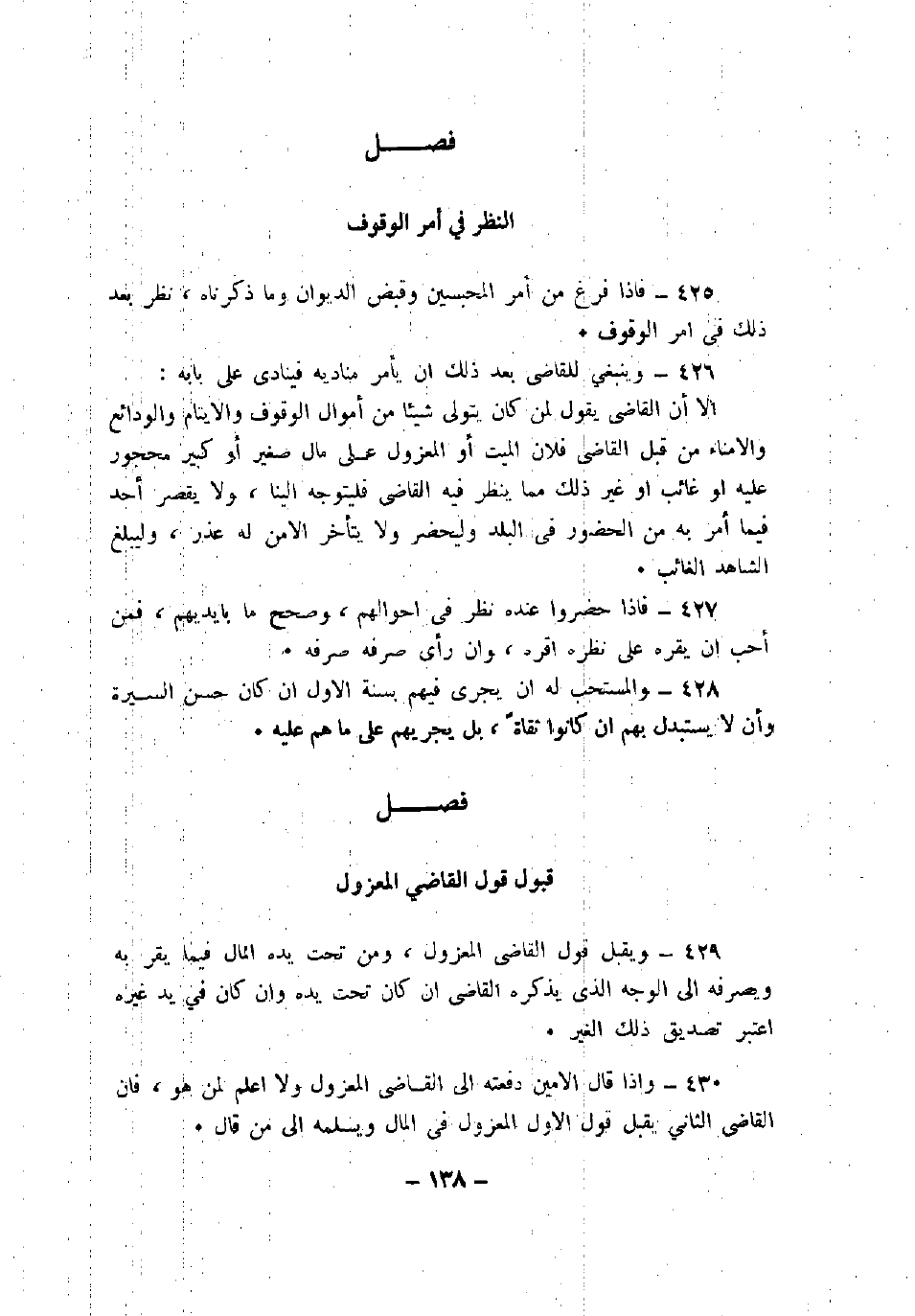 425 - فإذا فرغ من أمر المحبسين وقبض الديوان وما ذكرناه، نظر بعد ذلك في أمر الوقوف.