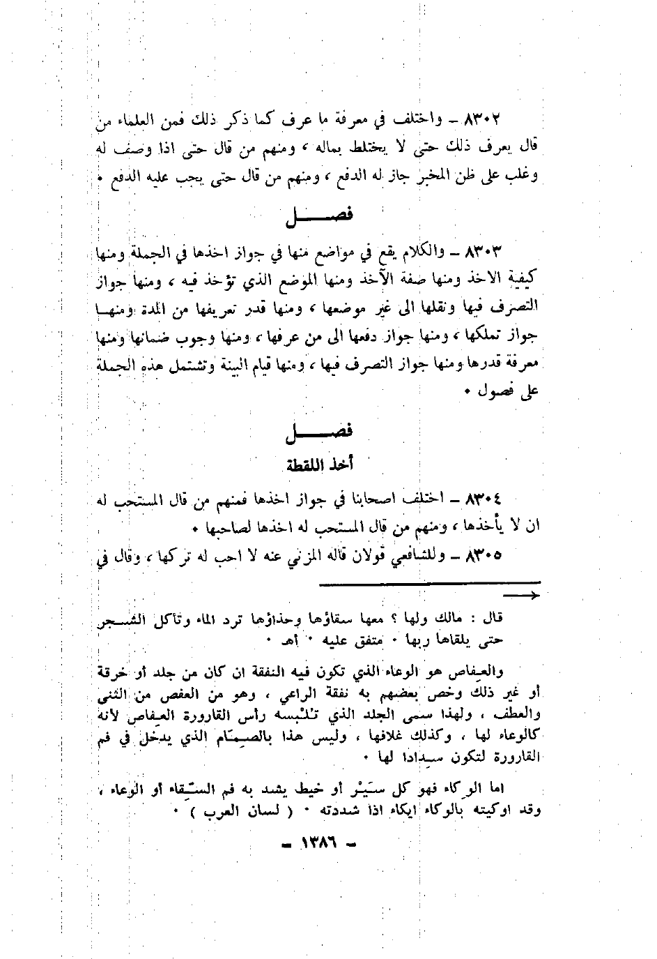 8303 - والكلام يقع في مواضع منها في جواز أخذها في الجملة ومنها كيفية الأخذ ومنها صفة الآخذ ومنها الموضع الذي تؤخذ فيه، ومنها جواز التصرف فيها ونقلها إلى غير موضعها، ومنها قدر تعريفها من المدة ومنها جواز تملكها. ومنها جواز دفعها إلى من عرفها، ومنها وجوب ضمانها ومنها معرفة قدرها ومنها جواز التصرف فيها، ومنها قيام البينة وتشتمل هذه الجملة على فصول.