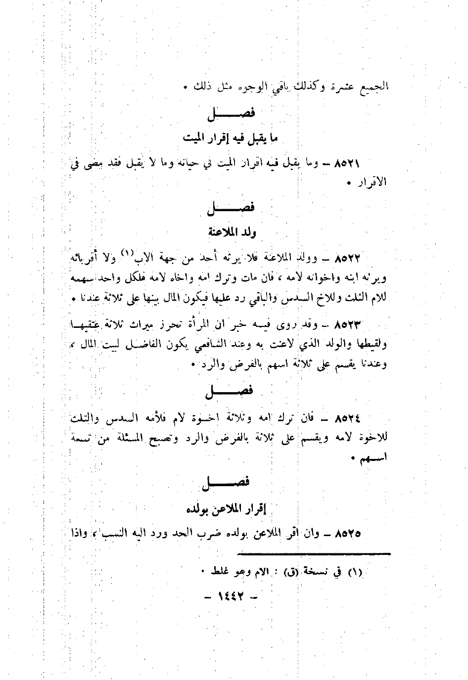 8522 - وولد الملاعنة فلا يرثه أحد من جهة الأب ولا أقربائه ويرثه ابنه وإخوانه لأمه، فإن مات وترك أمه وأخاه لأمه فلكل واحد سهمه للأم الثلث وللأخ السدس والباقي رد عليها فيكون المال بينها على ثلاثة عندنا.