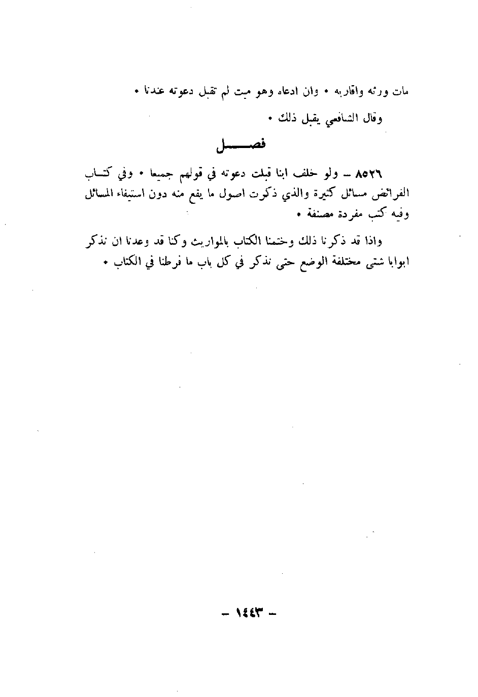 8526 - ولو خلف ابناً قبلت دعوته في قولهم جميعاً. وفي كتاب الفرائض مسائل كثيرة والذي ذكرت أصول ما يقع منه دون استيفاء المسائل وفيه كتب مفردة مصنفة.