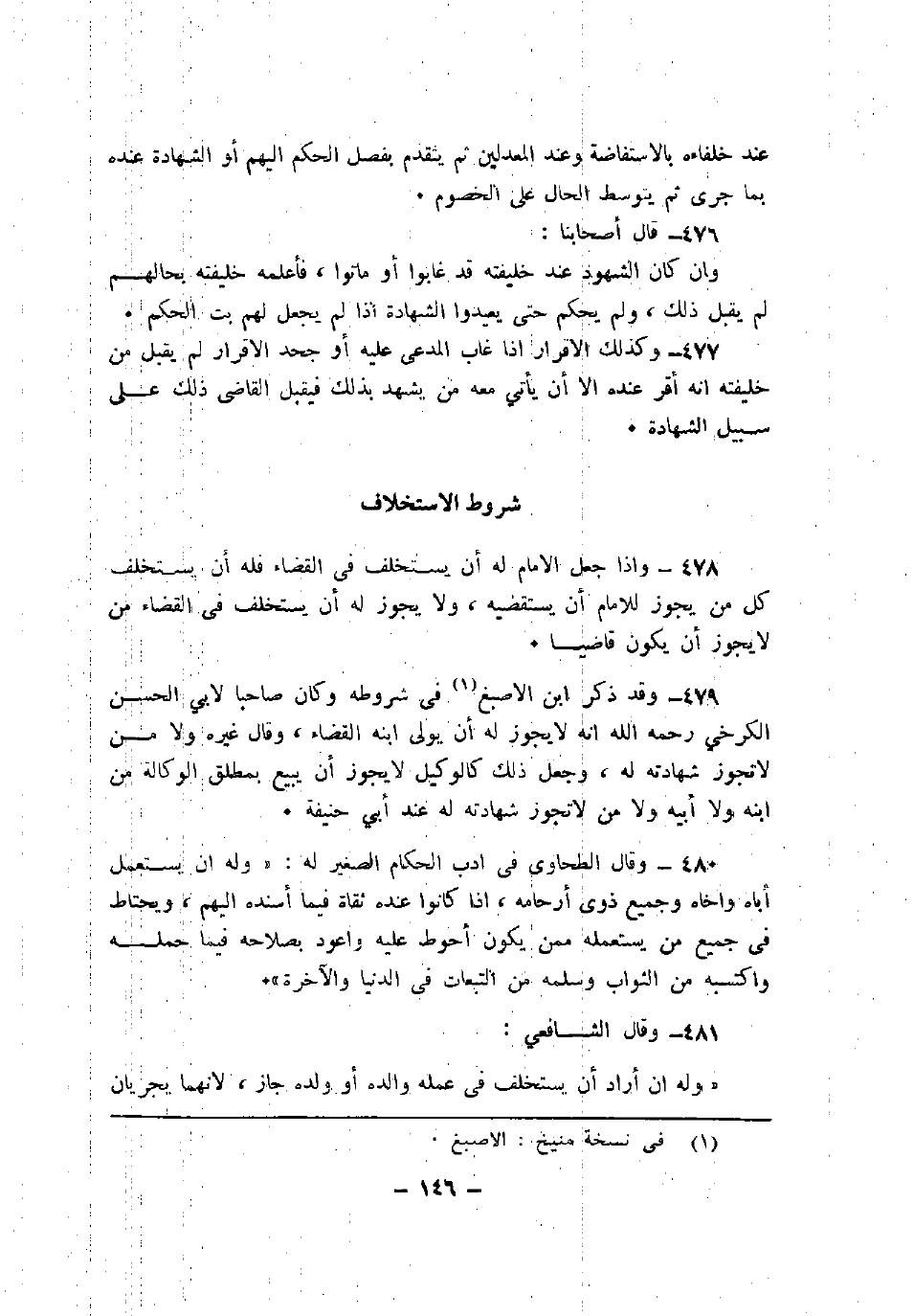 478 - وإذا جعل الإمام له أن يستخلف في القضاء فله أن يستخلف كل من يجوز للإمام أن يستقضيه، ولا يجوز له أن يستخلف في القضاء من لا يجوز أن يكون قاضياً.