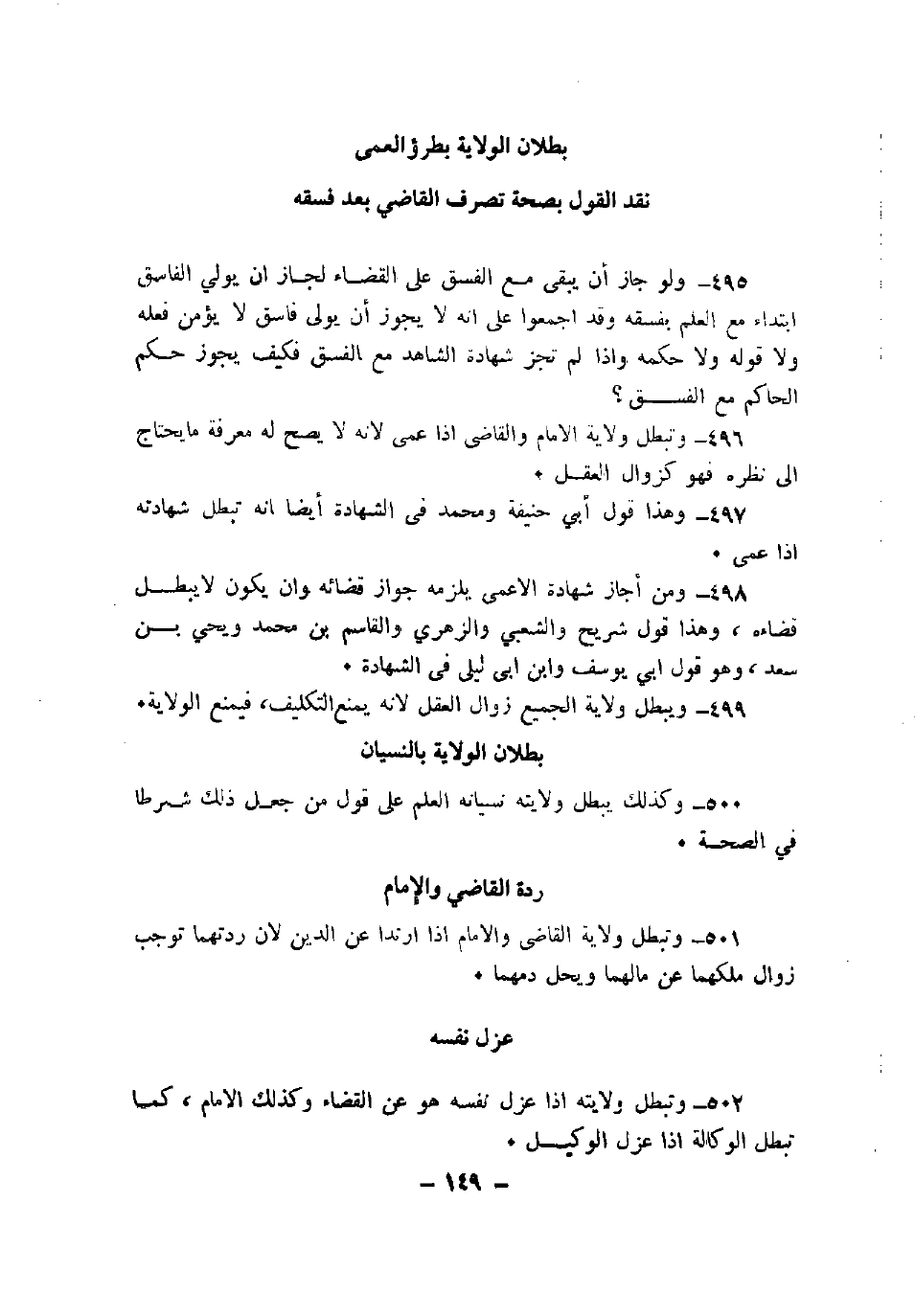 496 - وتبطل ولاية الإمام والقاضي إذا عمى لأنه لا يصح له معرفة ما يحتاج إلى نظره فهو كزوال العقل.