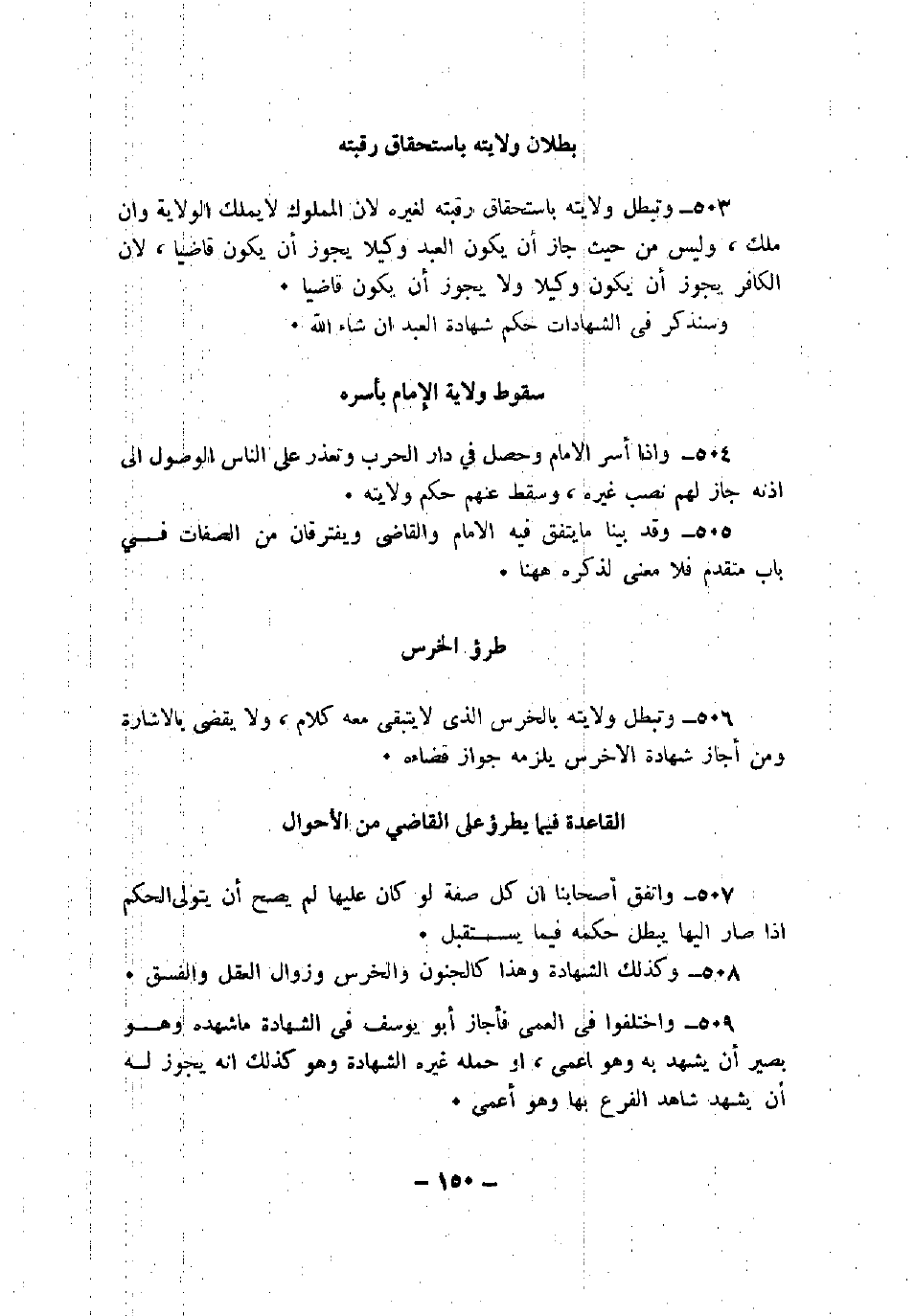 506 - وتبطل ولايته بالخرس الذي لا يتبقى معه كلام، ولا يقضي بالإشارة ومن أجاز شهادة الأخرس يلزمه جواز قضاءه.