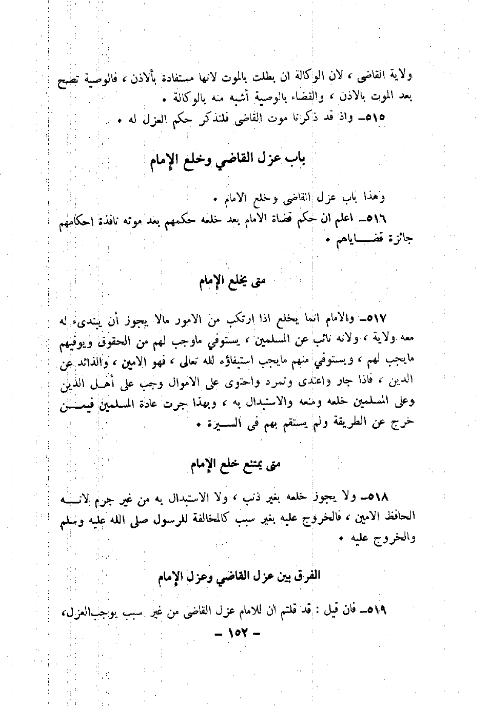 516 - اعلم أن حكم قضاة الإمام بعد خلعه حكمهم بعد موته نافذة أحكامهم جائزة قضاياهم.