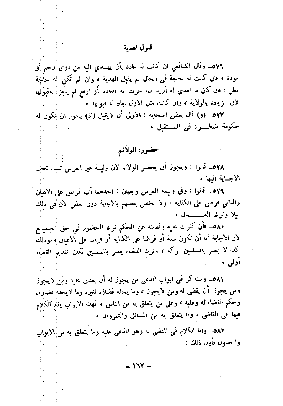 580 - فأن كثرت عليه وقطعته عن الحكم ترك الحضور في حق الجميع لأن الإجابة إما أن تكون سنة أو فرضاً على الكفاية أو فرضاً على الأعيان، وذلك كله لا يضر بالمسلمين تركه، وترك القضاء يضر بالمسلمين فكان تقديم القضاء أولى.