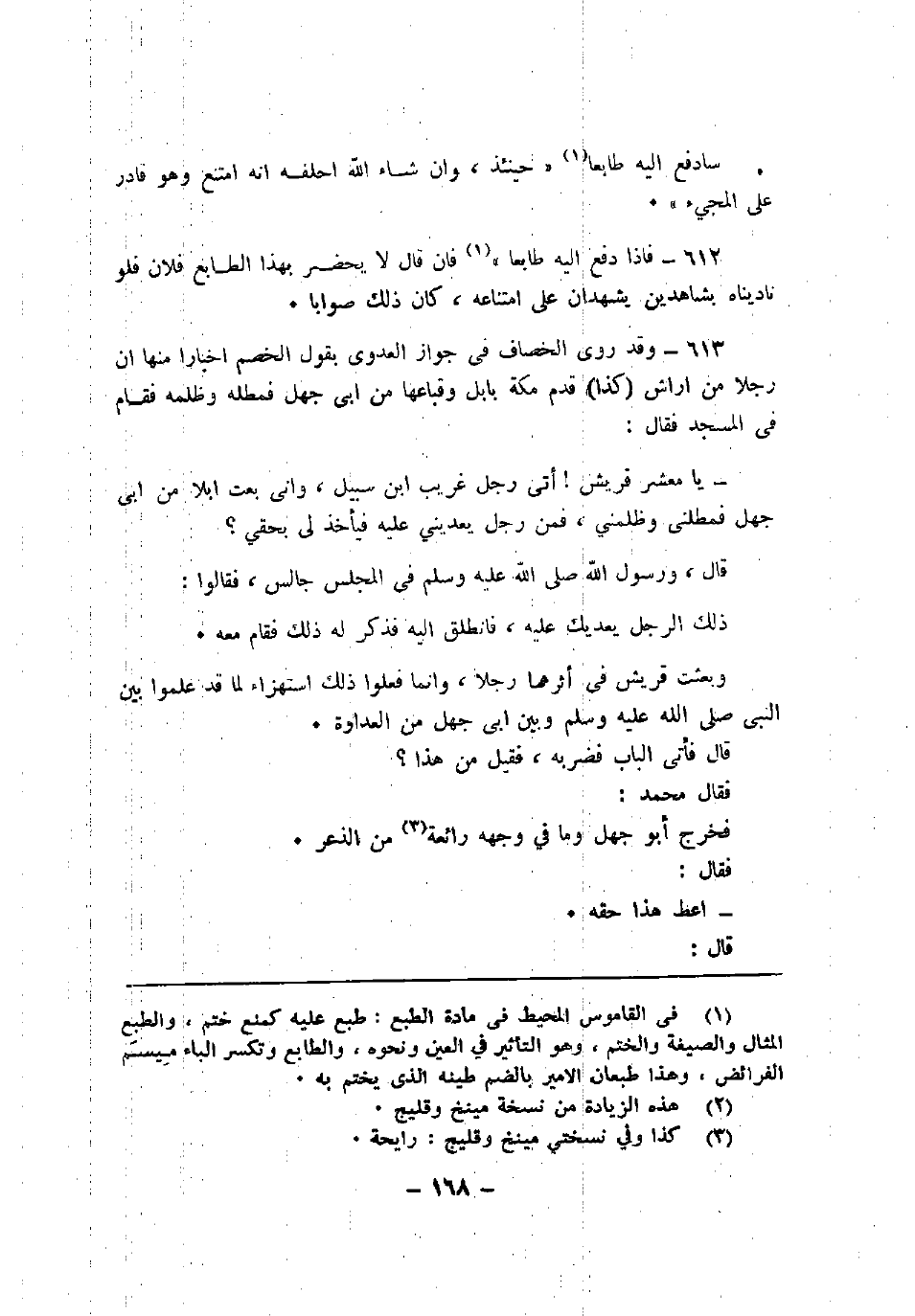 613 - وقد روى الخصاف في جواز العدوى بقول الخصم أخباراً منها أن رجلاً من أراش (كذا) قدم مكة بابل وقباعها من أبي جهل فمطله وظلمه فقام في المسجد فقال: