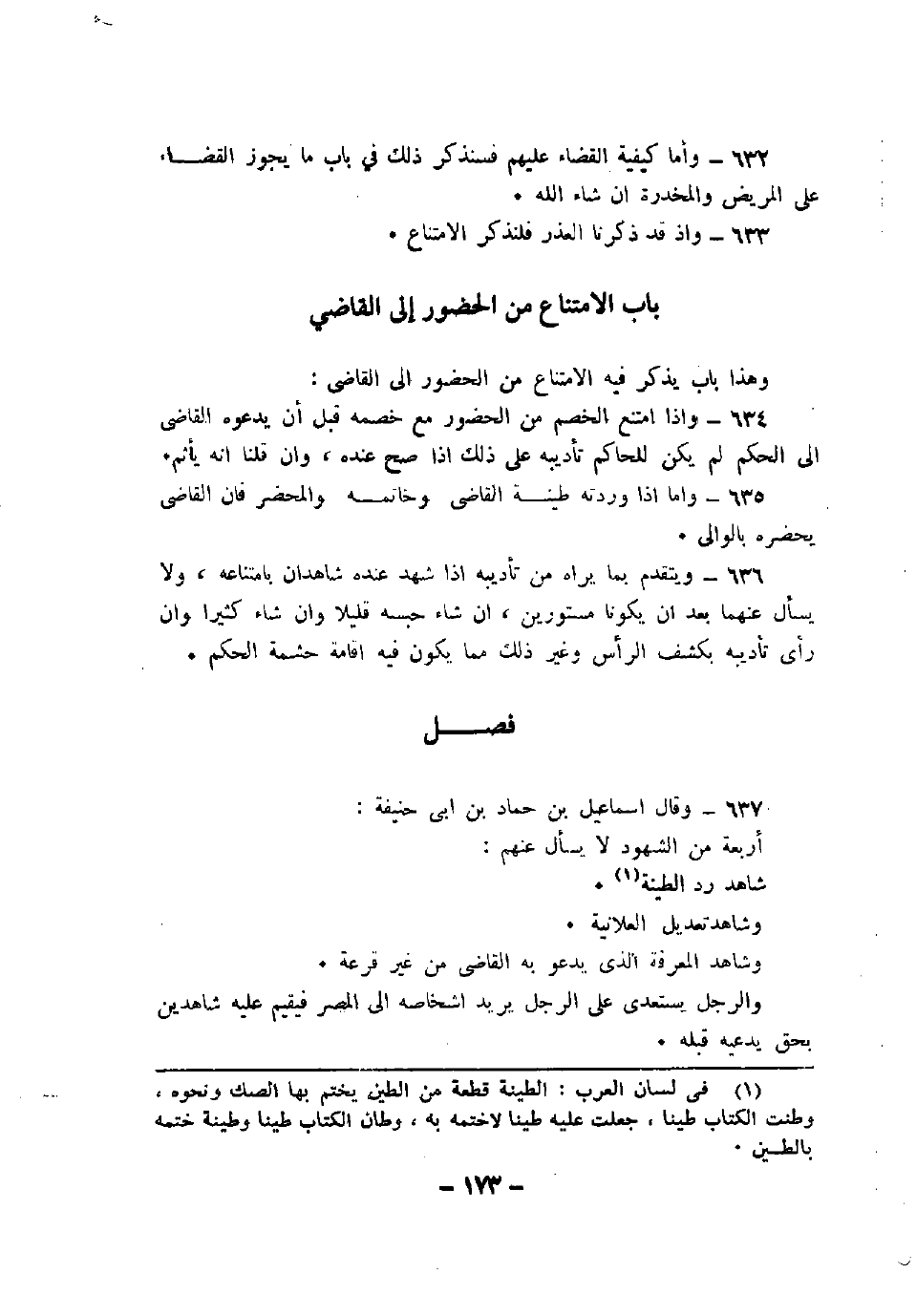 636 - ويتقدم بما يراه من تأديبه إذا شهد عنده شاهدان بامتناعه، ولا يسأل عنهما بعد أن يكونا مستورين، إن شاء حبسه قليلاً وإن شاء كثيراً وإن رأى تأديبه بكشف الرأس وغير ذلك مما يكون فيه إقامة حشمة الحكم.