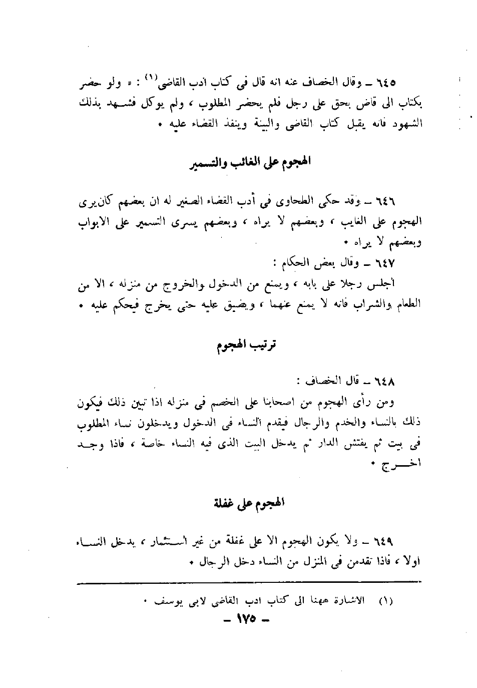 646 - وقد حكى الطحاوي في «أدب القضاء الصغير» له أن بعضهم كان يرى الهجوم على الغايب، وبعضهم لا يراه، وبعضهم يرى التسمير على الأبواب وبعضهم لا يراه.