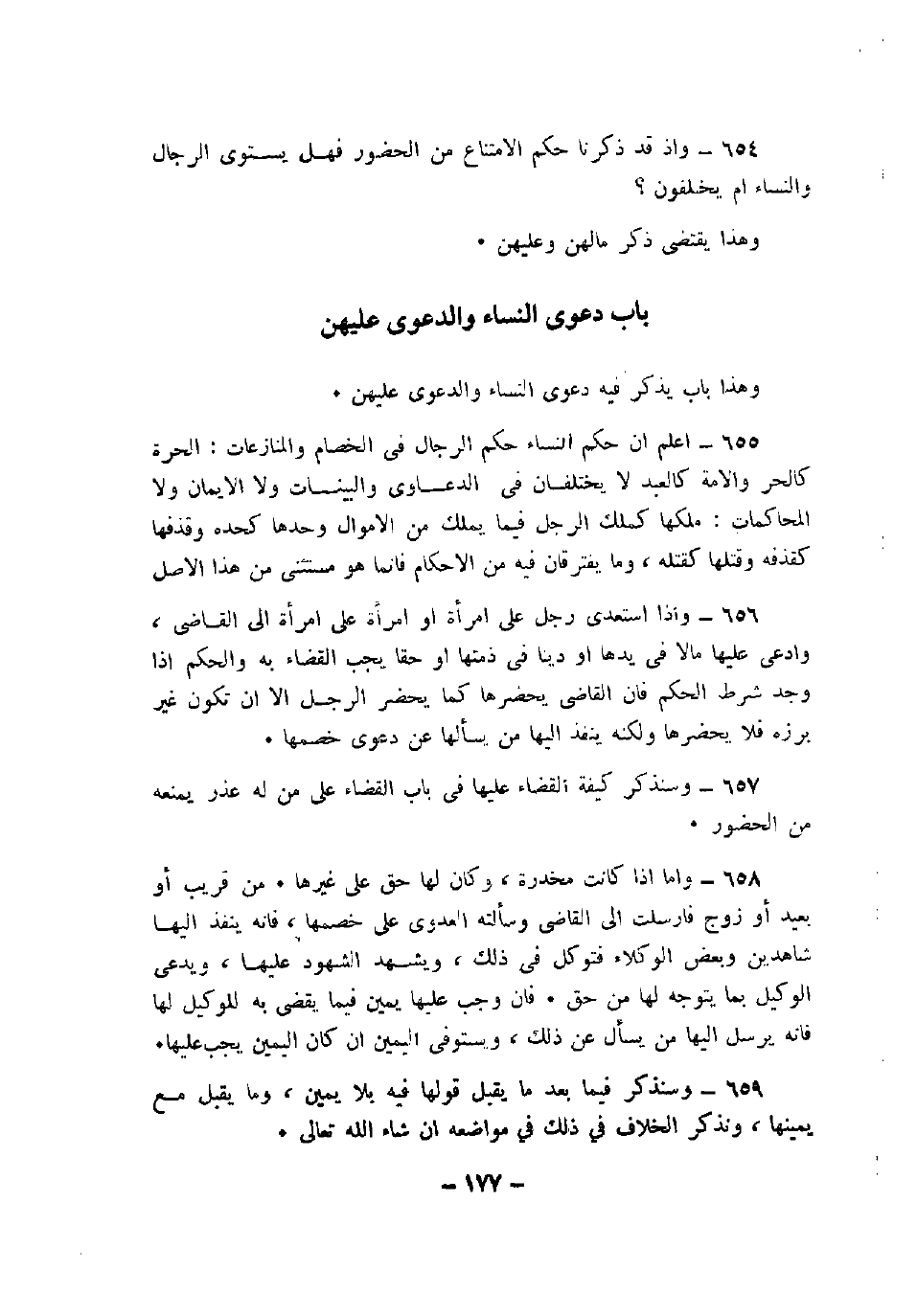655 - أعلم أن حكم النساء حكم الرجال في الخصام والمنازعات: الحرة كالحر والأمة كالعبد لا يختلفان في الدعاوى والبينات ولا الإيمان ولا المحاكمات: ملكها كملك الرجل فيما يملك من الأموال وحدها كحده وقذفها كقذفه وقتلها كقتله، وما يفترقان فيه من الأحكام فإنما هو مستثنى من هذا الأصل.