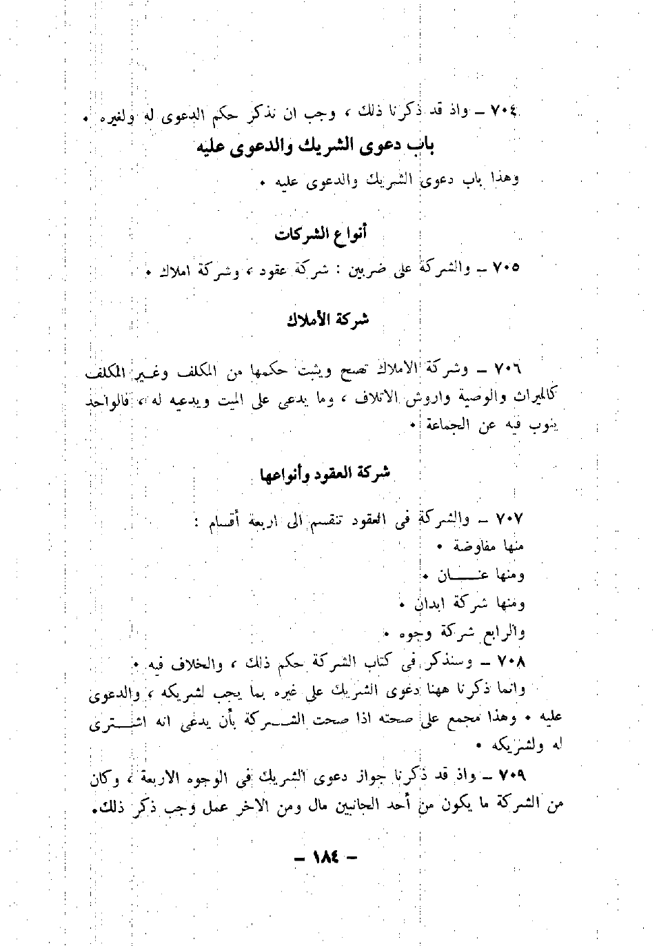 706 - وشركة الأملاك تصح ويثبت حكمها من المكلف وغير المكلف كالميراث والوصية واروش الاتلاف، وما يدعي على الميت ويدعيه له، فالواحد ينوب فيه عن الجماعة.
