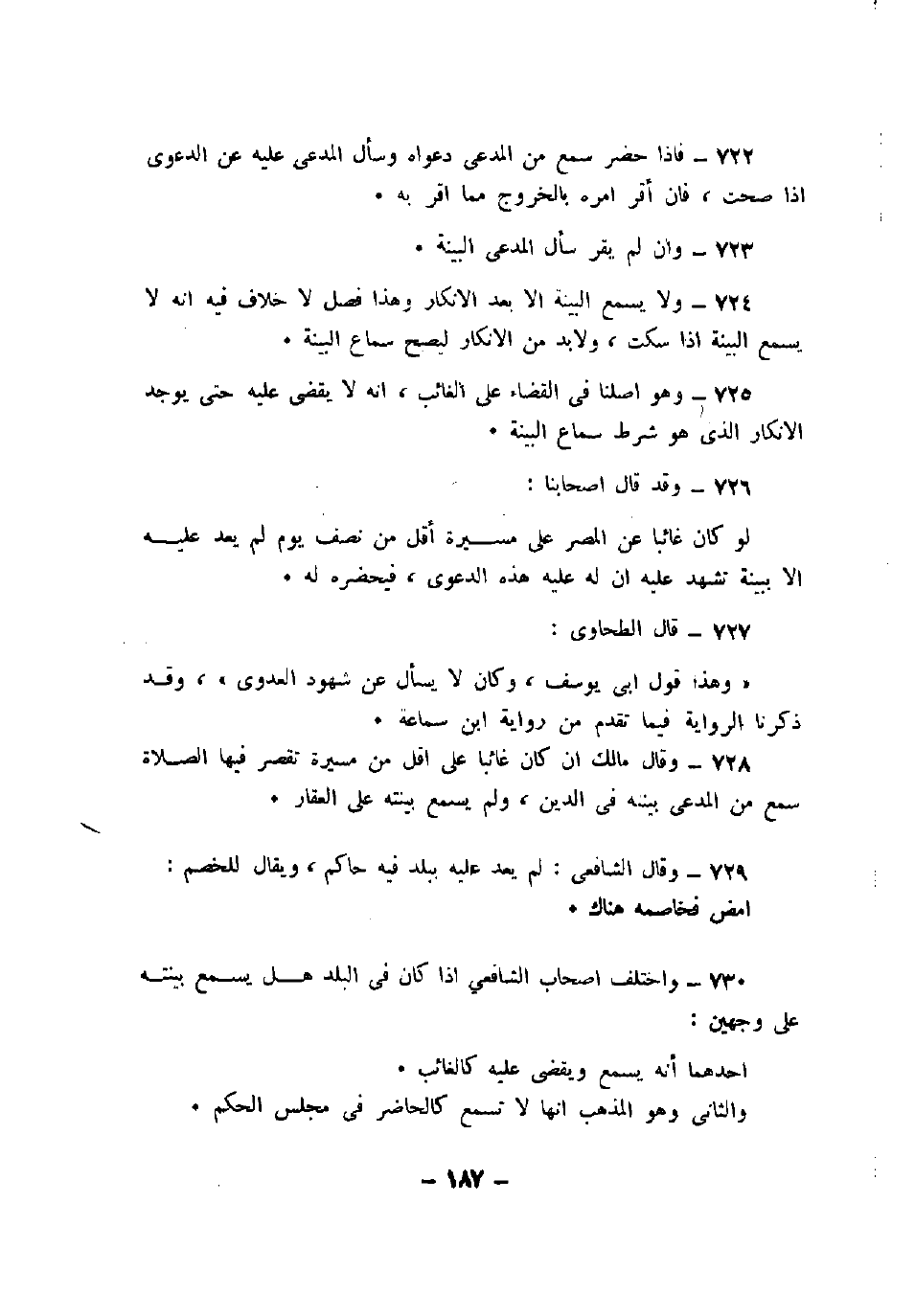 728 - وقال مالك أن كان غائباً على أقل من مسيرة تقصر فيه الصلاة سمع من المدعي بينه في الدين، ولم يسمع بنيته على العقار.