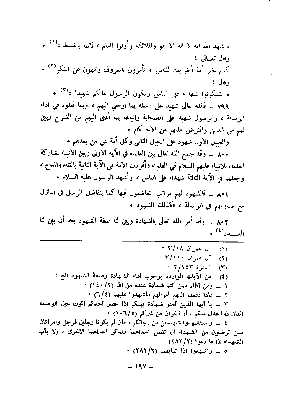 800 - وقد جمع الله تعالى بين العلماء في الآية الأولى وبين الأنبياء لمشاركة العلماء للأنبياء عليهم السلام في العلم، وأفردت الأمة في الآية الثانية بالثناء والمدح، وجعلهم في الآية الثالثة شهداء على الناس، وأشهد الرسول عليه السلام.