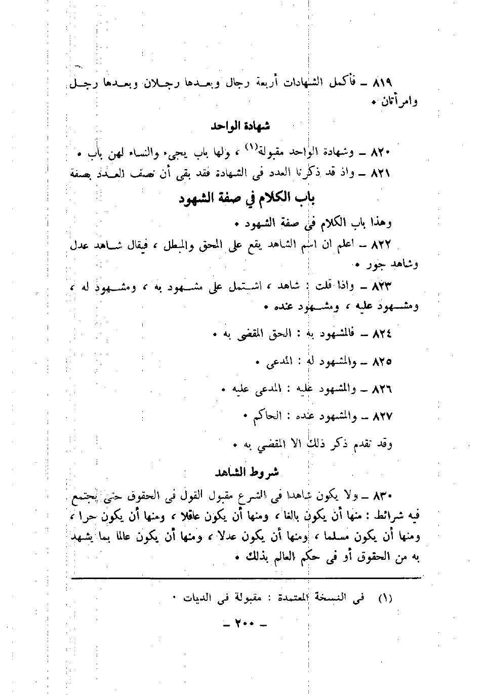 830 - ولا يكون شاهدا في الشرع مقبول القول في الحقوق حتى يجتمع فيه شرائط: منها أن يكون بالغاً، ومنها أن يكون عاقلاً، ومنها أن يكون حراً، ومنها أن يكون مسلماً، ومنها أن يكون عدلاً، ومنها أن يكون عالماً بما يشهد به من الحقوق أو في حكم العالم بذلك.
