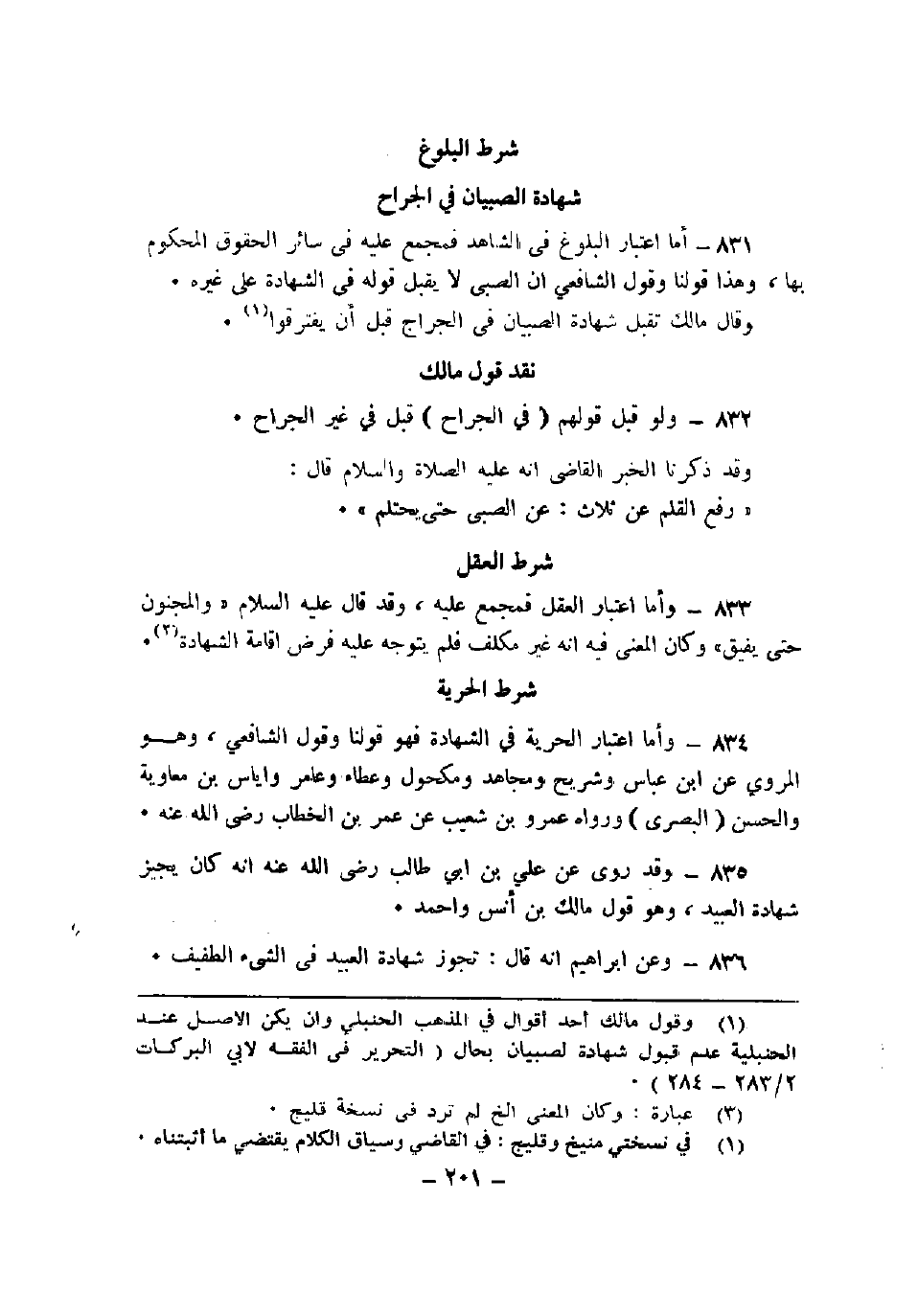 833 - وأما اعتبار العقل فمجمع عليه، وقد قال عليه السلام "والمجنون حتى يفيق" وكان المعنى فيه أنه غير مكلف فلم يتوجه عليه فرض إقامة الشهادة.