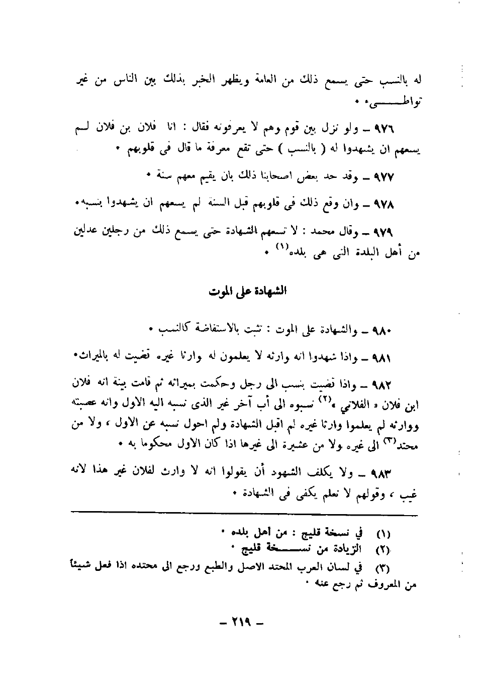 983 - ولا يكلف الشهود أن يقولوا أنه لا وارث لفلان غير هذا لأنه غيب، وقولهم لا نعلم يكفي في الشهادة.