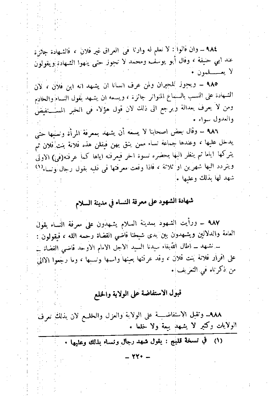 987 - ورأيت الشهود بمدينة السلام يشهدون على معرفة النساء بقول العامة والدلالين ويشهدون بين يدي شيخنا قاضي القضاة رحمه الله، فيقولون: