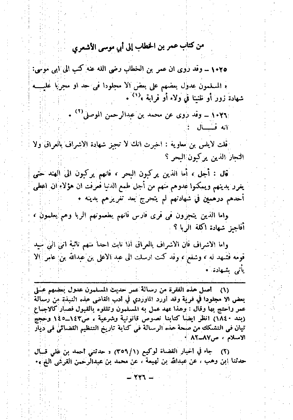 1025 - وقد روى أن عمر بن الخطاب -رضي الله عنه- كتب إلى أبي موسى: "المسلمون عدول بعضهم على بعض إلا مجلوداً في حد أو مجرباً عليه شهادة زور أو ظنينا في ولاء أو قرابة".