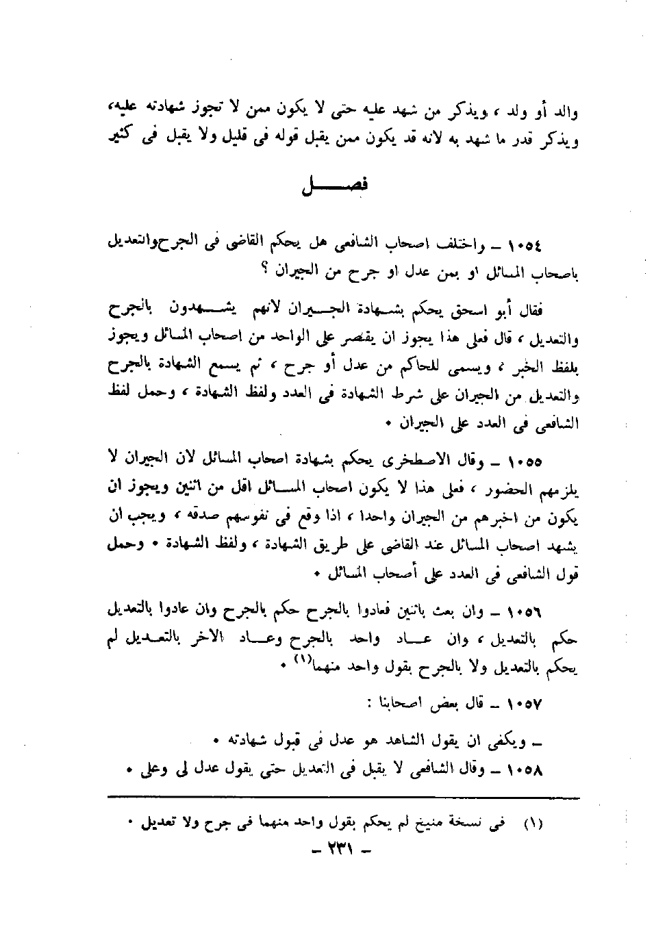 1054 - واختلف أصحاب الشافعي هل يحكم القاضي في الجرح والتعديل بأصحاب المسائل أو بمن عدل أو جرح من الجيران؟