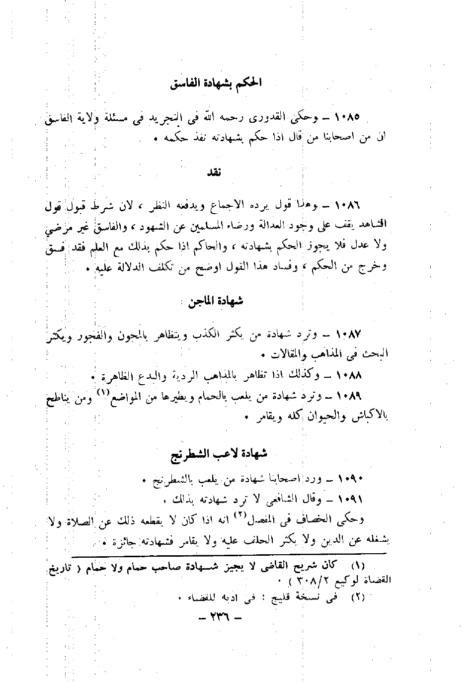 1087 - وترد شهادة من يكثر الكذب ويتظاهر بالمجون والفجور ويكثر البحث في المذاهب والمقالات.