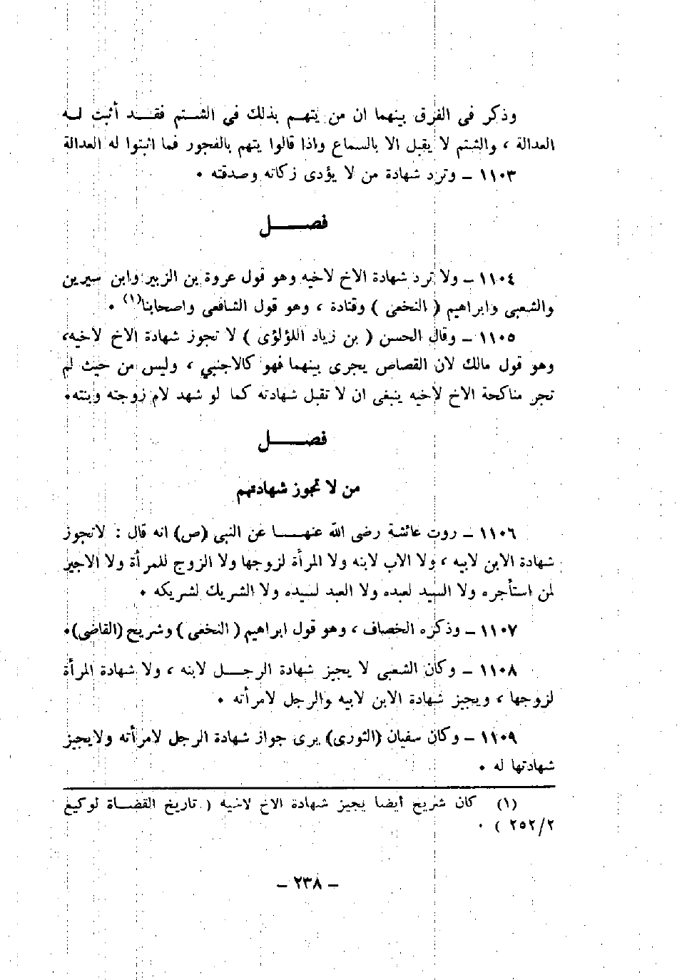 1108 - وكان الشعبي لا يجيز شهادة الرجل لابنه، ولا شهادة المرأة لزوجها، ويجيز شهادة الابن لأبيه والرجل لامرأته.