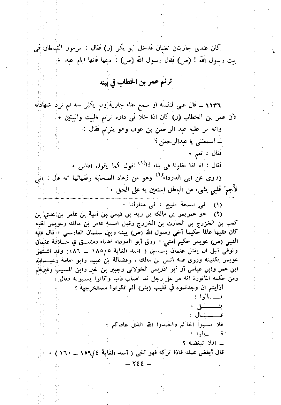 1136 - فإن غنى لنفسه أو سمع غناء جارية ولم يكثر منه لم ترد شهادته لأن عمر بن الخطاب -رضي الله عنه- كان إذا خلا في داره ترنم بالبيت والبيتين.