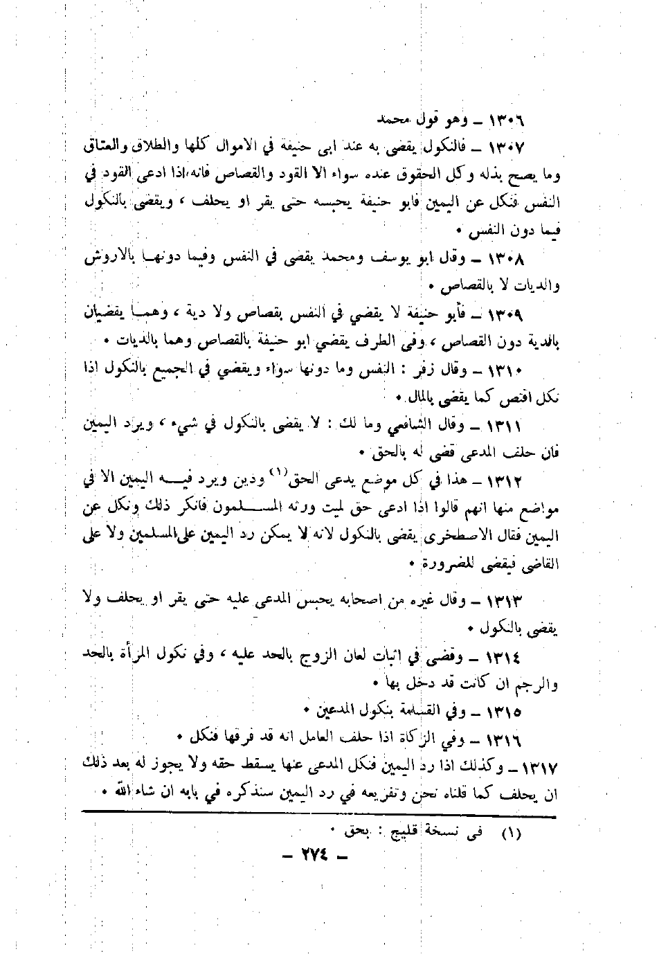 1317 - وكذلك إذا أراد اليمين فنكل المدعى عنها يسقط حقه ولا يجوز له بعد ذلك أن يحلف كما قلناه نحن وتفريعه في رد اليمين سنذكره في بابه إن شاء الله.