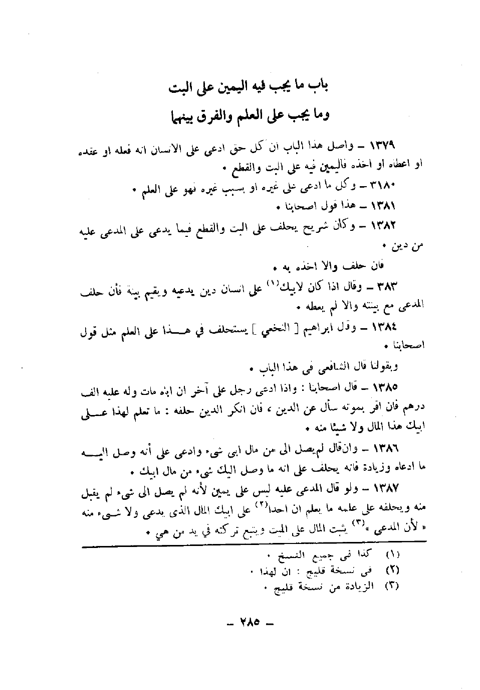 1379 - وأصل هذا الباب أن كل حق ادعى على الإنسان أنه فعله أو عقده أو أعطاه أو أخذه فاليمين فيه على البت والقطع.