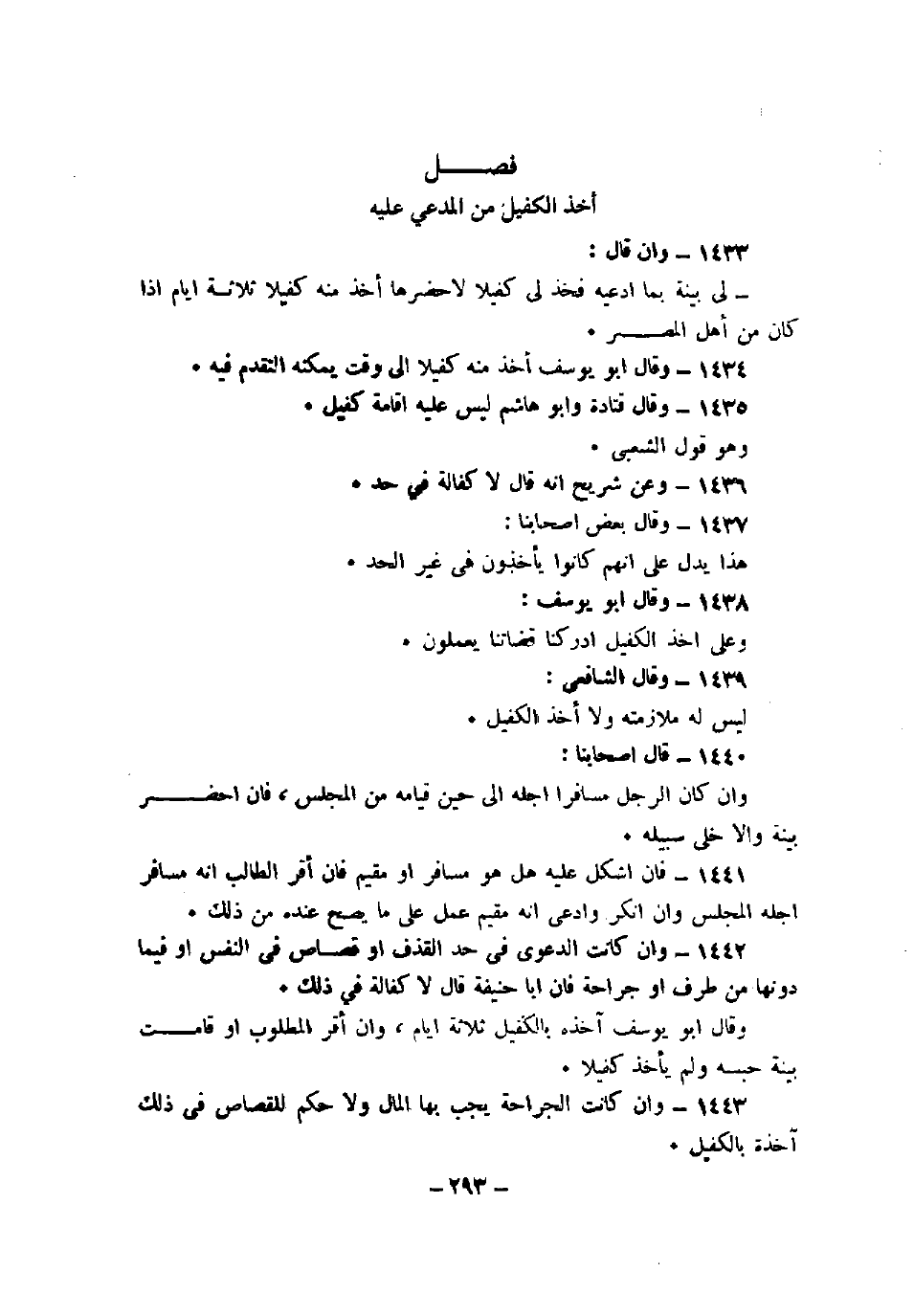 1442 - وإن كانت الدعوى في حد القذف أو قصاص في النفس أو فيما دونها من طرف أو جراحة فإن أبا حنيفة قال لا كفالة في ذلك.