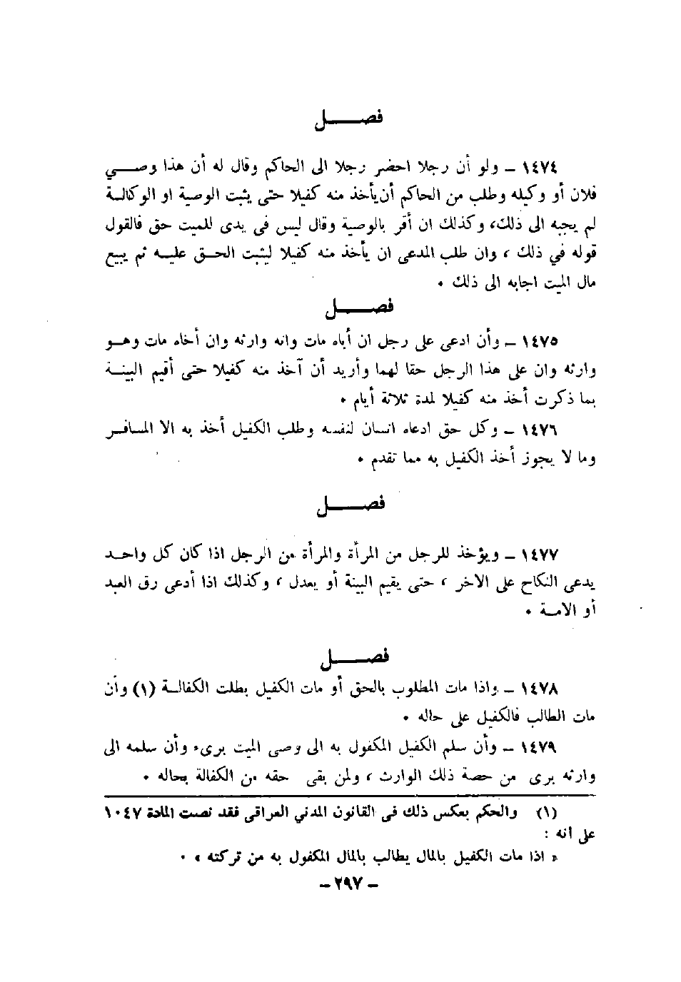 1474 - ولو أن رجلاً أحضر رجلاً إلى الحاكم وقال له أن هذا وصي فلان أو وكيله وطلب من الحاكم أن يأخذ منه كفيلاً حتى يثبت الوصية أو الوكالة لم يجبه إلى ذلك، كذلك إن أقر بالوصية وقال ليس في يدي للميت حق فالقول قوله في ذلك، وإن طلب المدعى أن يأخذ منه كفيلاً ليثبت الحق عليه ثم يبيع مال الميت أجابه إلى ذلك.