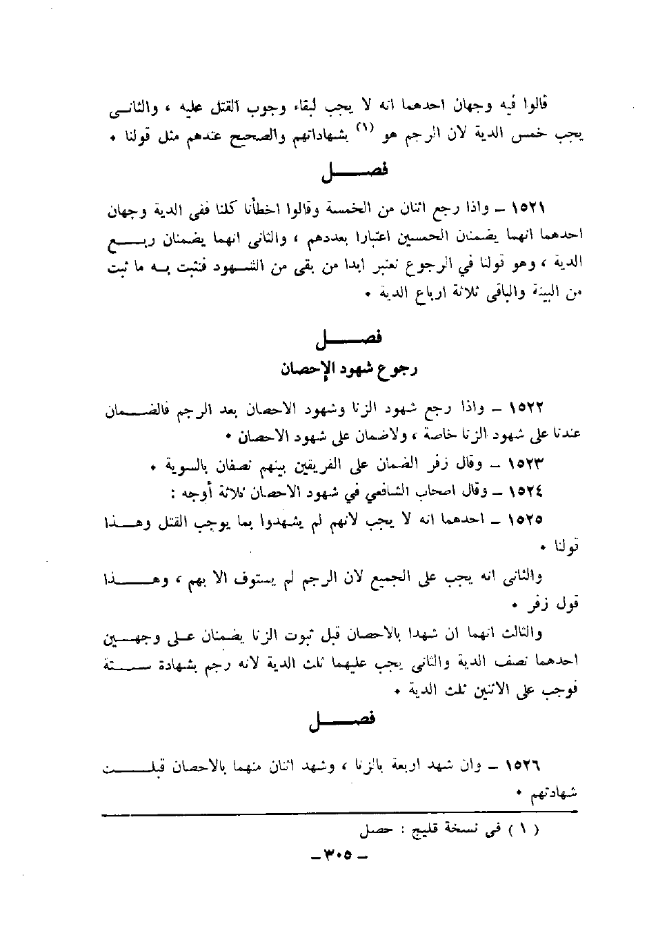 1522 - وإذا رجع شهود الزنا وشهود الإحصان بعد الرجم فالضمان عندنا على شهود الزنا خاصة، ولا ضمان على شهود الإحصان.