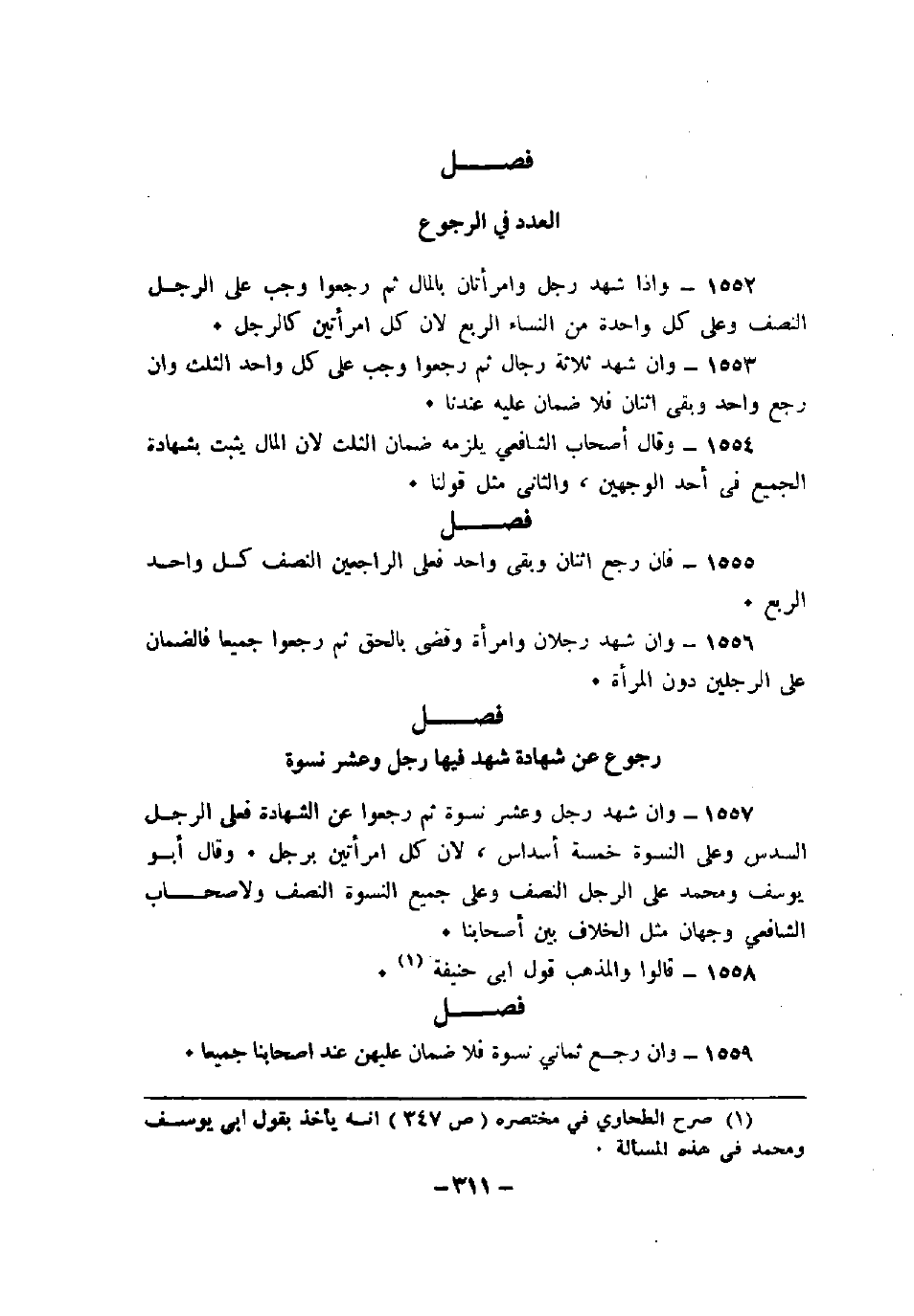 1552 - وإذا شهد رجل وامرأتان بالمال ثم رجعوا وجب على الرجل النصف وعلى كل واحدة من النساء الربع لأن كل امرأتين كالرجل.