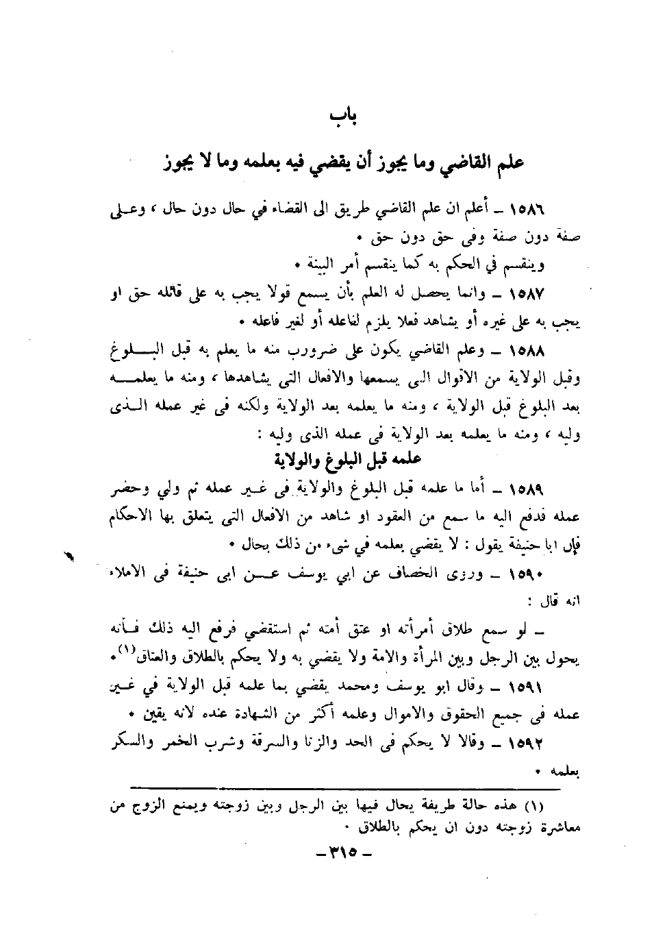 1588 - وعلم القاضي يكون على ضرورب منه ما يعلم به قبل البلوغ وقبل الولاية من الأقوال التي يسمعها والأفعال التي يشاهدها، ومنه ما يعلمه بعد البلوغ قبل الولاية، ومنه ما يعلمه بعد الولاية ولكنه في غير عمله الذي وليه، ومنه ما يعلمه بعد الولاية في عمله الذي وليه: