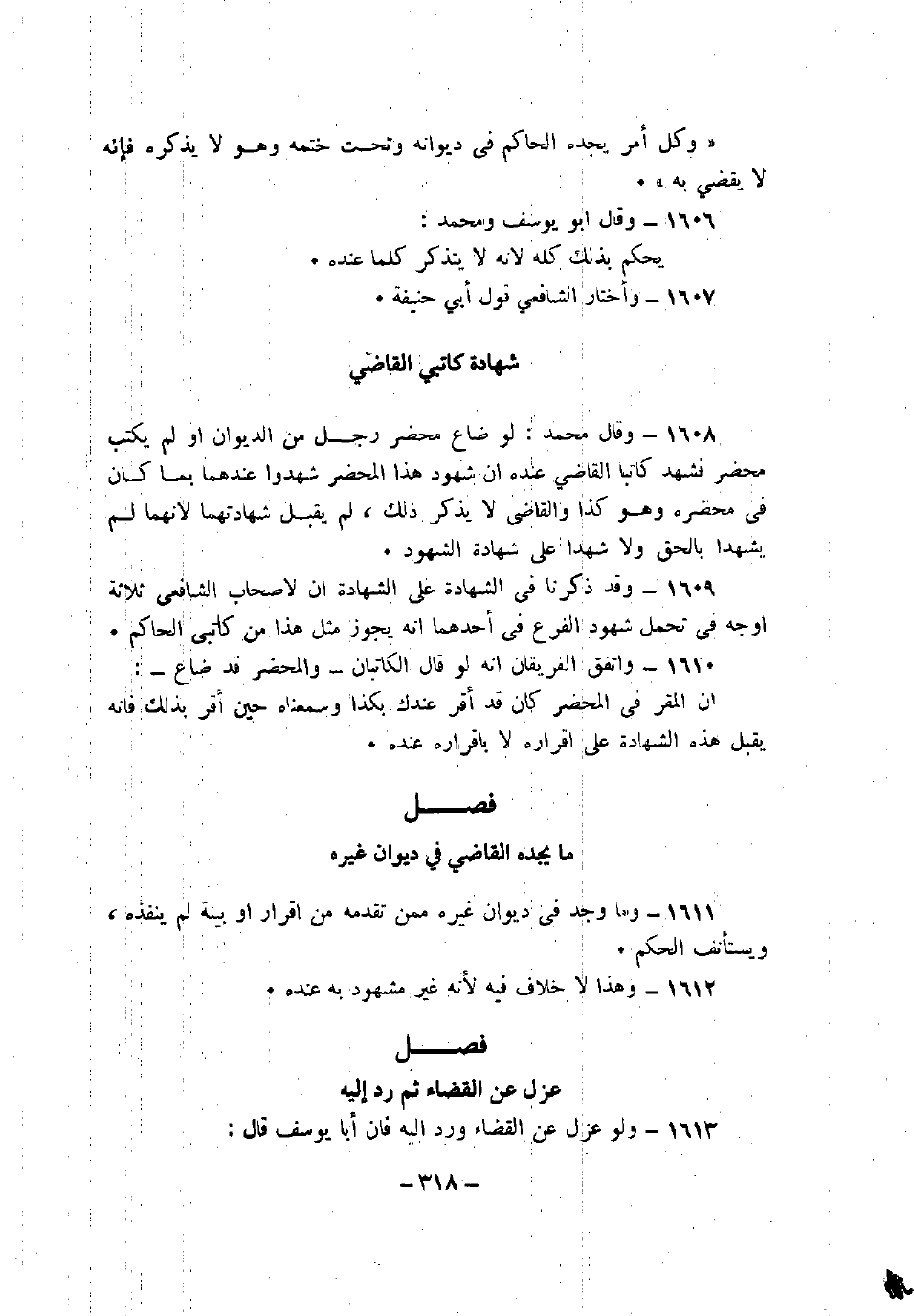 1611 - وما وجد في ديوان غيره ممن تقدمه من إقرار أو بينة لم ينفذه، ويستأنف الحكم.