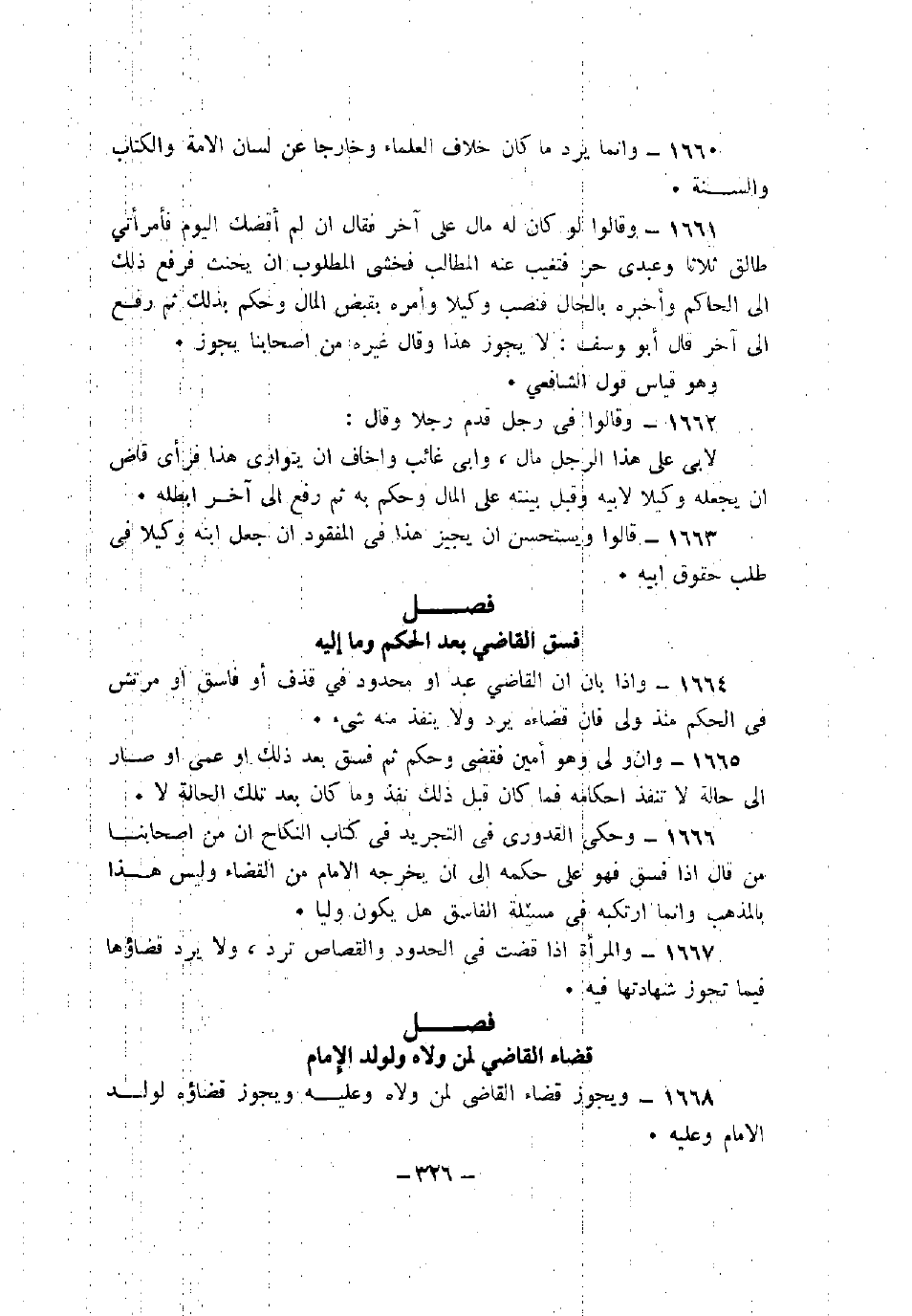 1664 - وإذا بان أن القاضي عبد أو محدود في قذف أو فاسق أو مرتش في الحكم منذ ولى فإن قضاءه يرد ولا ينفذ منه شيء.