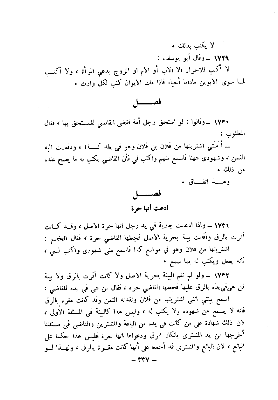 1731 - وإذا ادعت جارية في يد رجل أنها حرة الأصل، وقد كانت أقرت بالرق وأقامت بينة بحرية الأصل فجعلها القاضي حرة، فقال الخصم: اشتريتها من فلان وهو في موضع كذا فاسمع مني شهودي واكتب لي، فإنه يفعل ويكتب له بما سمع.