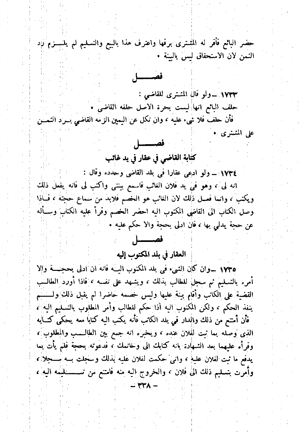 1735 - وإن كان الشيء في بلد المكتوب إليه فإنه إن أدلى بحجة وإلا أمره بالتسليم ثم سجل للطالب بذلك، يشهد على نفسه، فإذا أورد الطالب القضية على الكاتب وأقام بينة عليها وليس خصمه حاضراً لم يقبل ذلك ولم ينفذ الحكم، ولكن المكتوب إليه إذا حكم للطالب وأمر المطلوب بالتسليم إليه، فإن امتنع من ذلك والدار في بلد الكاتب فإنه يكتب إليه كتاباً معه يحكي كتابه الذ يوصله بما ثبت لفلان عنده، ويخبره أنه جمع بين الطالب والمطلوب، وقرأه عليهما بعد الشهادة بأنه كتابك إلى وخاتمك، فدعوته بحجة فلم يأت بما يدفع ما ثبت لفلان عليه، وإني حكمت لفلان عليه بذلك وسجلت به سجلاً، وأمرت بتسليم ذلك إلى فلان، والخروج إليه منه فامتنع من تسليمه إليه،