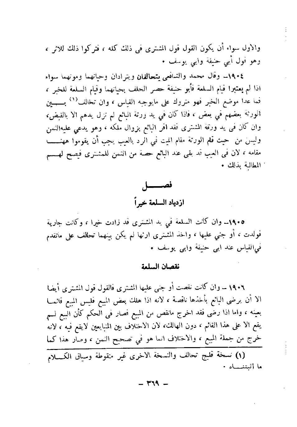 1905 - وإن كانت السلعة في يد المشتري قد زادت خيراً، وكانت جارية فولدت، أو جني عليها، وأخذ المشتري إرثها لم يكن بينهما تحالف على ما تقدم في القياس عند أبي حنيفة وأبي يوسف.
