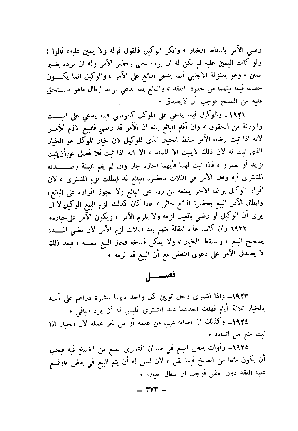1925 - وفوات بعض المبيع في ضمان المشتري يمنع من الفسخ فيه فيجب أن يكون مانعاً من الفسخ فيما بقي، لأن ليس له أن يتم البيع في بعض ما وقع عليه العقد دون بعض فوجب أن يبطل خياره.