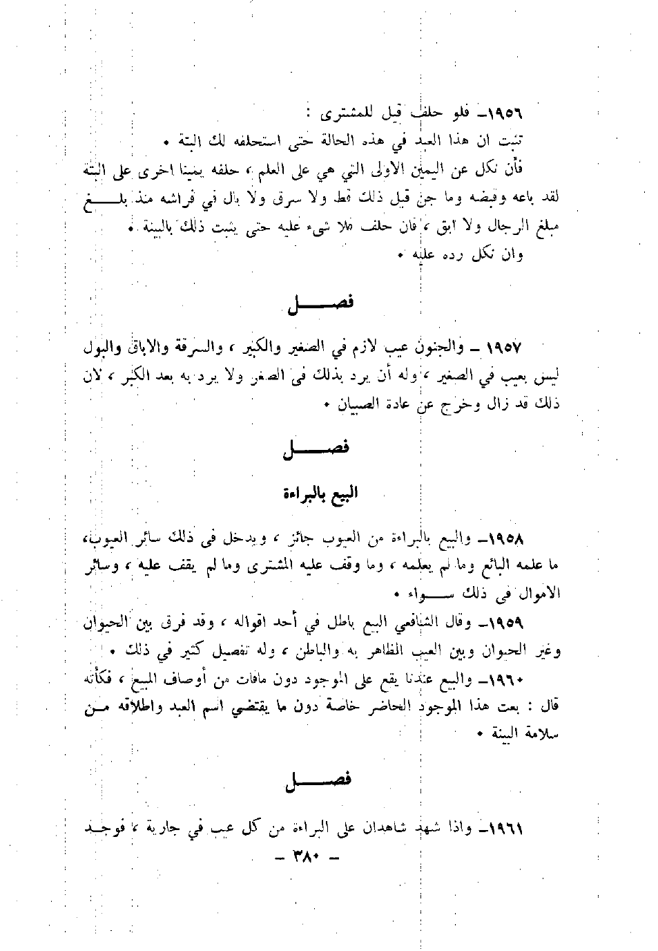 1958 - والبيع بالبراءة من العيوب جائز، ويدخل في ذلك سائر العيوب، ما علمه البائع وما لم يعلمه، وما وقف عليه المشتري وما لم يقف عليه، وسائر الأموال في ذلك سواء.