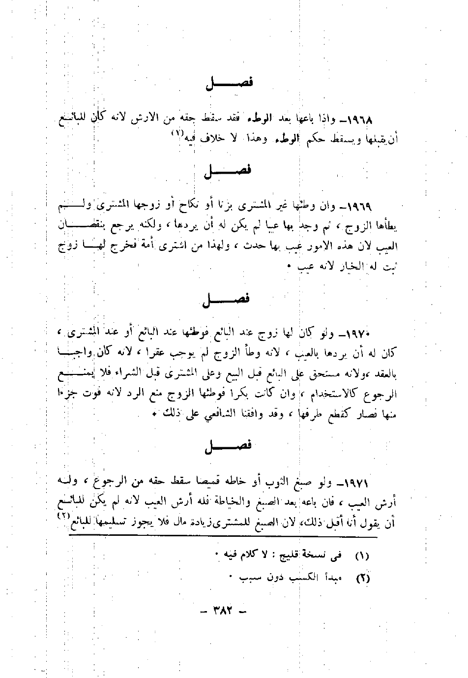 1971 - ولو صبغ الثوب أو خاطه قميصاً سقط حقه من الرجوع، وله أرش العيب، فإن باعه بعد الصبغ والخياطة فله أرش لأنه لم يكن للبائع أن يقول أنا أقبل ذلك، لأن الصبغ للمشتري زيادة مال فلا يجوز تسليمها للبائع