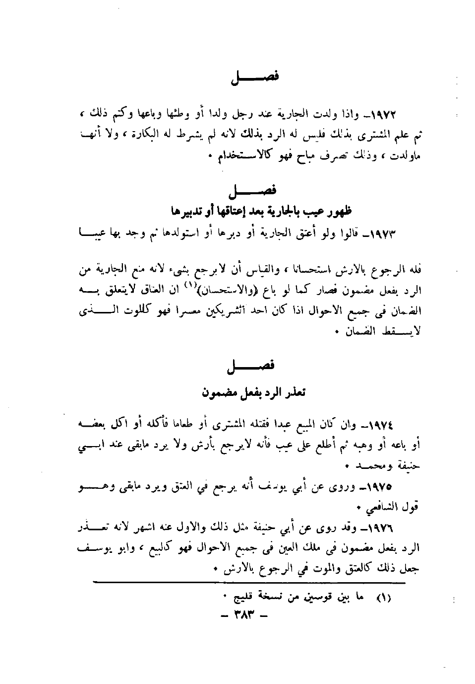 1972 - وإذا ولدت الجارية عند رجل ولداً أو وطئها وباعها وكتم ذلك، ثم علم المشتري بذلك فليس له الرد بذلك لأنه لم يشرط له البكارة، ولا أنها ما ولدت، وذلك تصرف مباح فهو كالاستخدام.