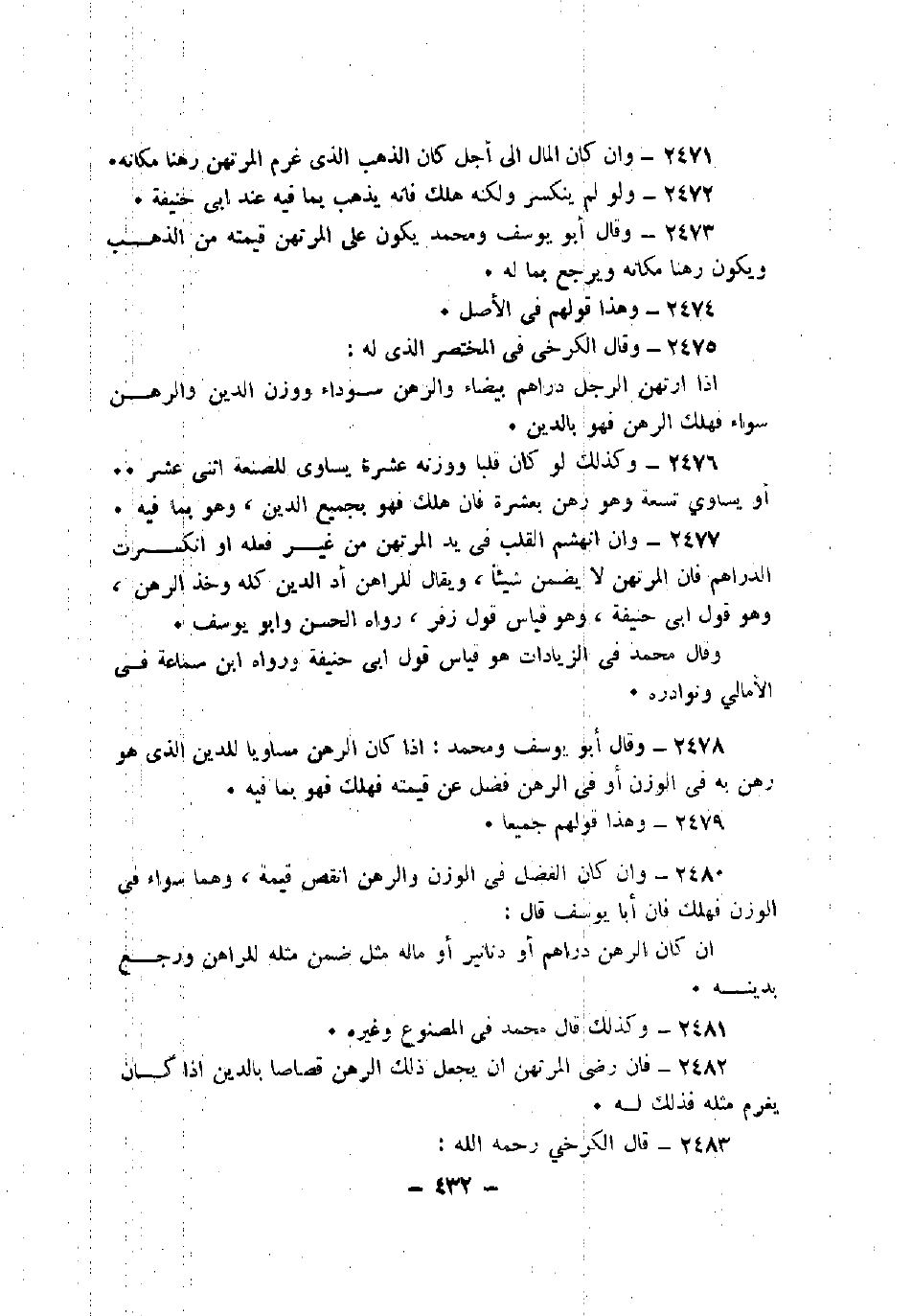 2477 - وأن أنهشم القلب في يد المرتهن من غير فعله أو انكسرت الدراهم فأن المرتهن لا يضمن شيئا، ويقال للراهن أد الدين كله وخذ الرهن، وهو قول أبي حنيفة، وهو قياس قول زفر، رواه الحسن وأبو يوسف.
