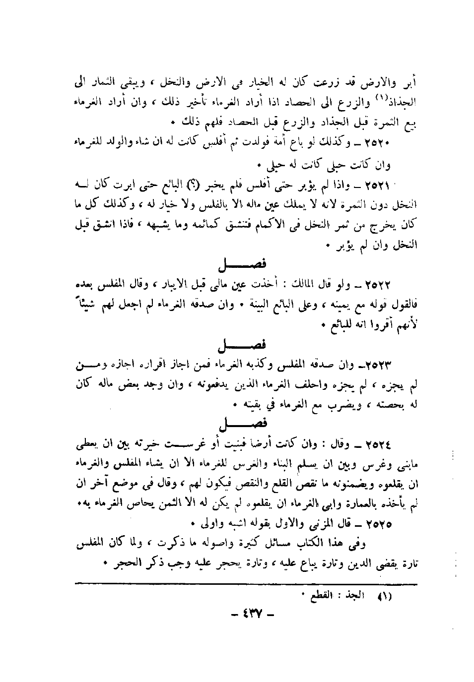 2521 - وإذا لم يؤبر حتى أفلس فلم يخبر (؟) البائع حتى أبرت كان له النخل دون الثمرة لأنه لا يملك عين ماله إلا بالفلس ولا خيار له، وكذلك كل ما كان يخرج من ثمر النخل في الأكمام فتشق كمائمه وما يشبهه، فإذا اشق قبل النخل وأن لم يؤبر.