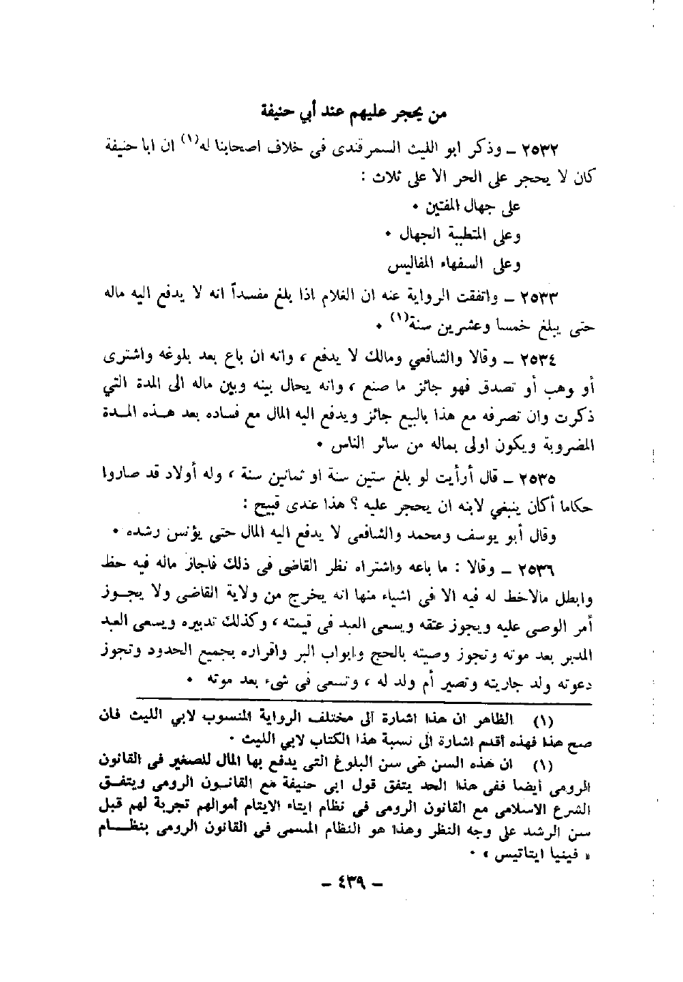2532 - وذكر أبو الليث السمرقندي في خلاف أصحابنا له أن أبا حنيفة كان لا يحجر على الحر إلا على ثلاث: